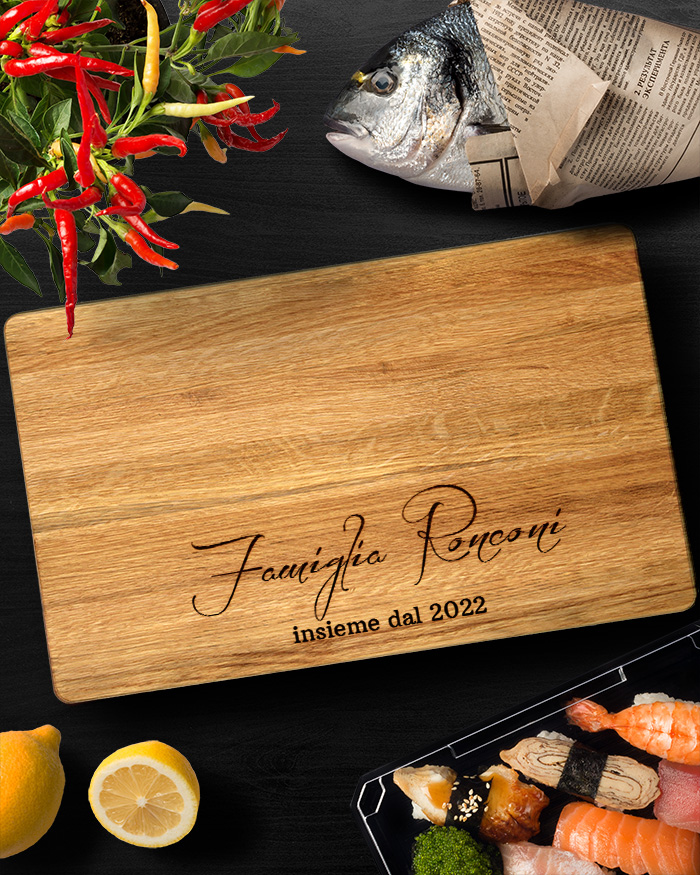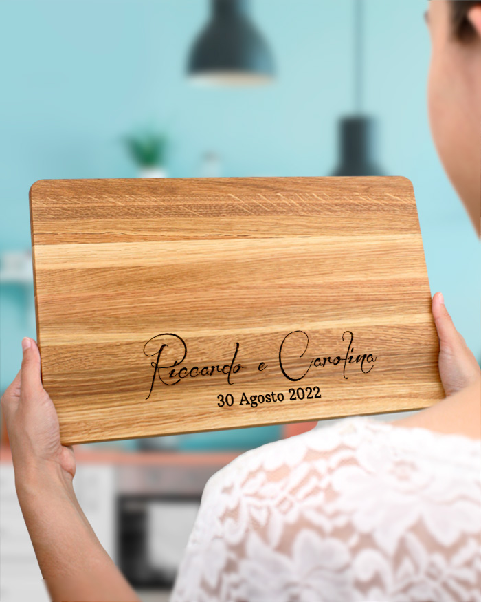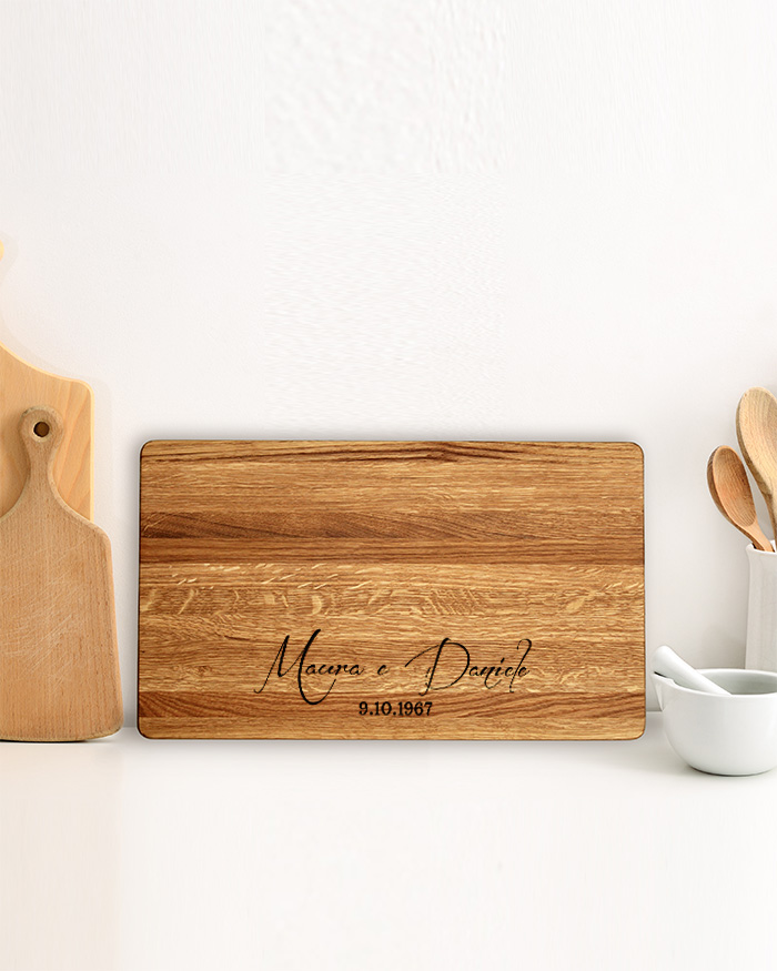 Elegante Tagliere di legno personalizzato con un’incisione con i vostri nomi e la data. Un regalo perfetto per festeggiare il vostro anniversario, matrimonio o qualsiasi data importante per voi! Il tagliere è disponibile in varie dimensioni, tra legno di ciliegio e pregiatissimo rovere. Ideale per servire ottimi antipasti, portare in tavola le vostre pietanze o anche come decorazione originale ed unica per la cucina.