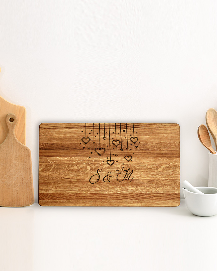 Dolcissimo Tagliere di legno personalizzato con un’incisione con le vostre iniziali. Un regalo perfetto per festeggiare il vostro anniversario, matrimonio o qualsiasi data importante per voi! Il tagliere è disponibile in varie dimensioni, tra legno di ciliegio e pregiatissimo rovere. Ideale per servire ottimi antipasti, portare in tavola le vostre pietanze o anche come decorazione originale ed unica per la cucina.