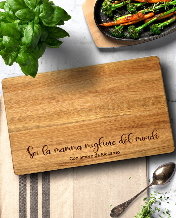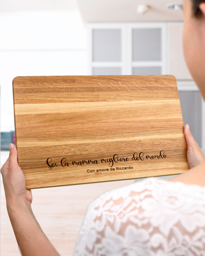 Delizioso tagliere di legno personalizzato con una dedica incisa per la mamma migliore del mondo. Un pensiero perfetto per la mamma del tuo cuore! Il tagliere è disponibile in varie dimensioni, tra legno di ciliegio e pregiatissimo rovere. Ideale per servire ottimi antipasti, portare in tavola le vostre pietanze o anche come decorazione originale ed unica per la cucina.