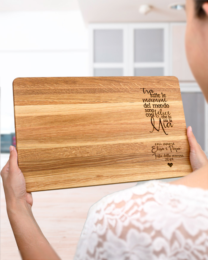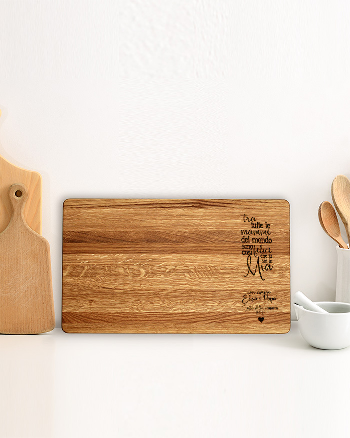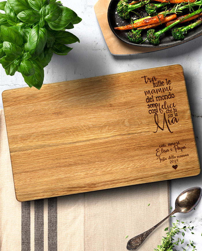 Dolce tagliere di legno personalizzato con una dedica incisa per la mamma. Un pensiero perfetto per ringraziare la tua mamma di tutto quello che fa per te! Il tagliere è disponibile in varie dimensioni, tra legno di ciliegio e pregiatissimo rovere. Ideale per servire ottimi antipasti, portare in tavola le vostre pietanze o anche come decorazione originale ed unica per la cucina.