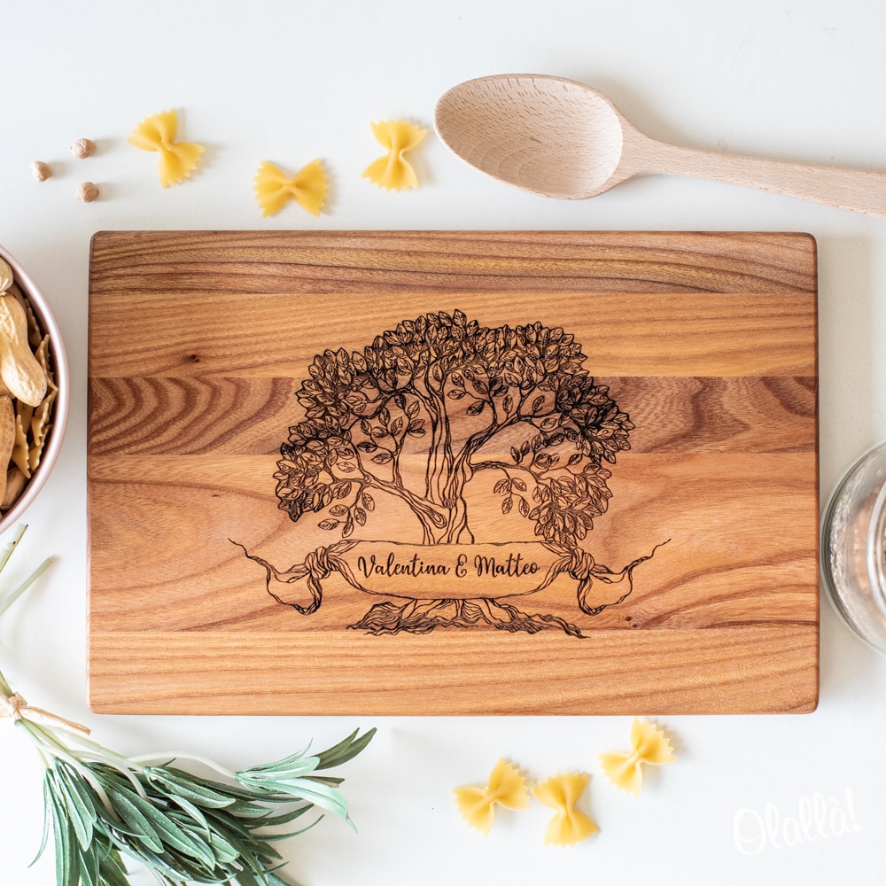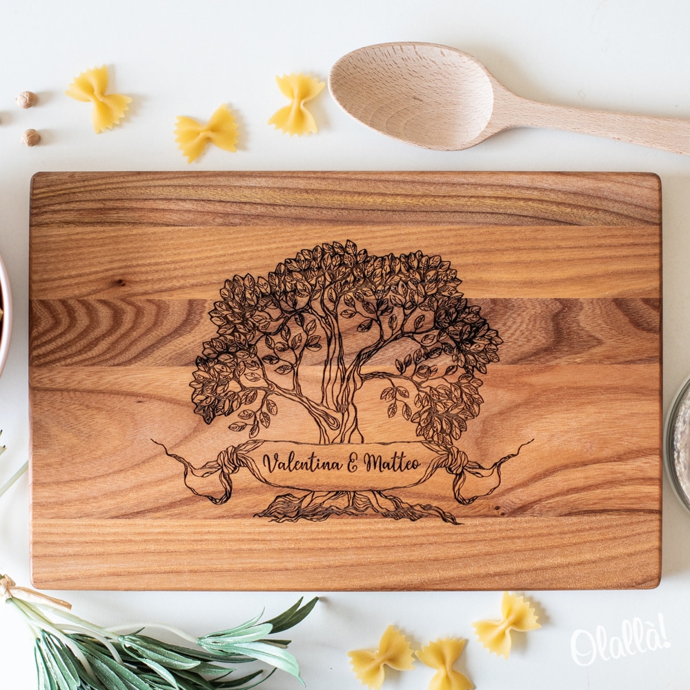 Bellissimo tagliere personalizzato con l’incisione dei vostri nomi in corsivo e decorato da uno splendido albero della vita. Fantastico ed evocativo regalo di San Valentino che conquisterà la tua dolce metà. E’ anche il dono perfetto per una coppia che celebra il tempo passato insieme…con gusto! Il tagliere è disponibile in varie dimensioni e tipi di legno. Ideale per servire ottimi antipasti, portare in tavola le vostre pietanze o anche come decorazione originale ed unica per la cucina.