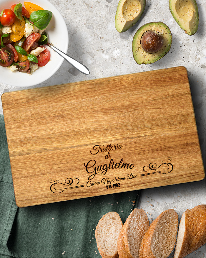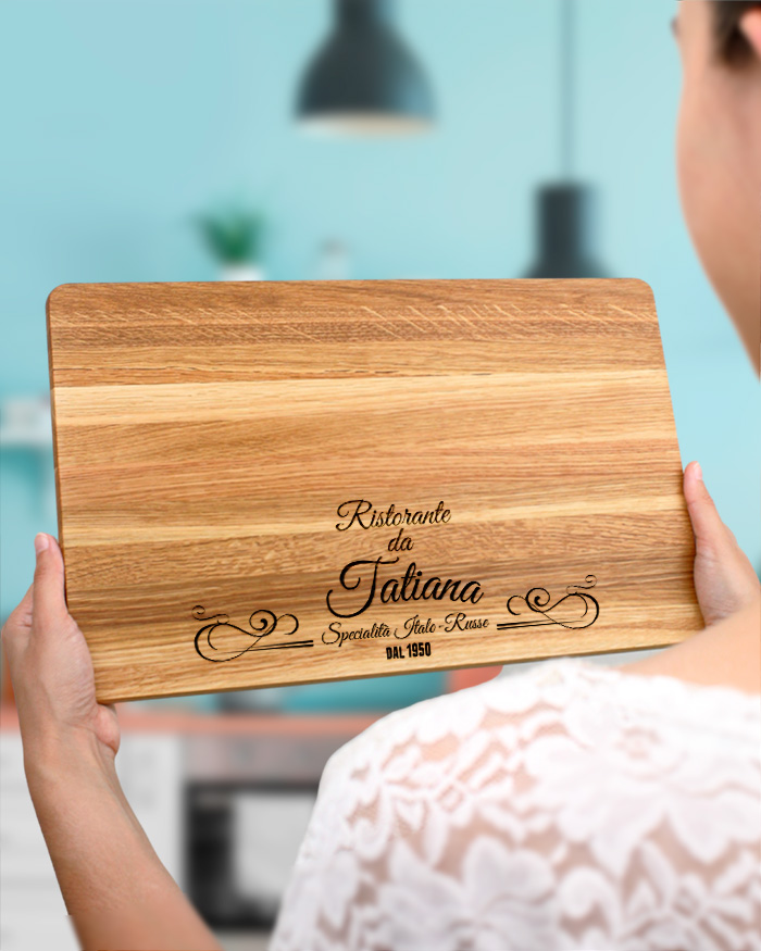 Stupendo Tagliere di legno personalizzato con la frase “Trattoria di” e il nome del destinatario. Un dono perfetto per chi ama la cucina, che saprà apprezzare questo regalo ricercato e unico. Il tagliere è disponibile in varie dimensioni, tra legno di ciliegio e pregiatissimo rovere. Ideale per servire ottimi antipasti, portare in tavola le vostre pietanze o anche come decorazione originale ed unica per la cucina.
