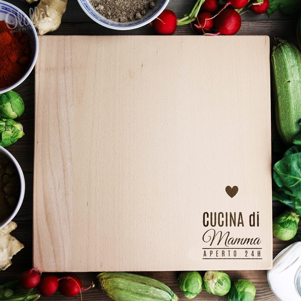 Bellissimo tagliere in legno. Solido e resistente, verrà personalizzato con la frase incisa “Cucina da Mamma, aperto 24H”. Un’idea regalo azzeccatissima per la vostra mamma amante della cucina. Il tagliere è disponibile in varie dimensioni e tipi di legno. Ideale per servire ottimi antipasti, portare in tavola le vostre pietanze o anche come decorazione originale ed unica per la cucina.