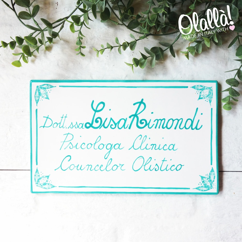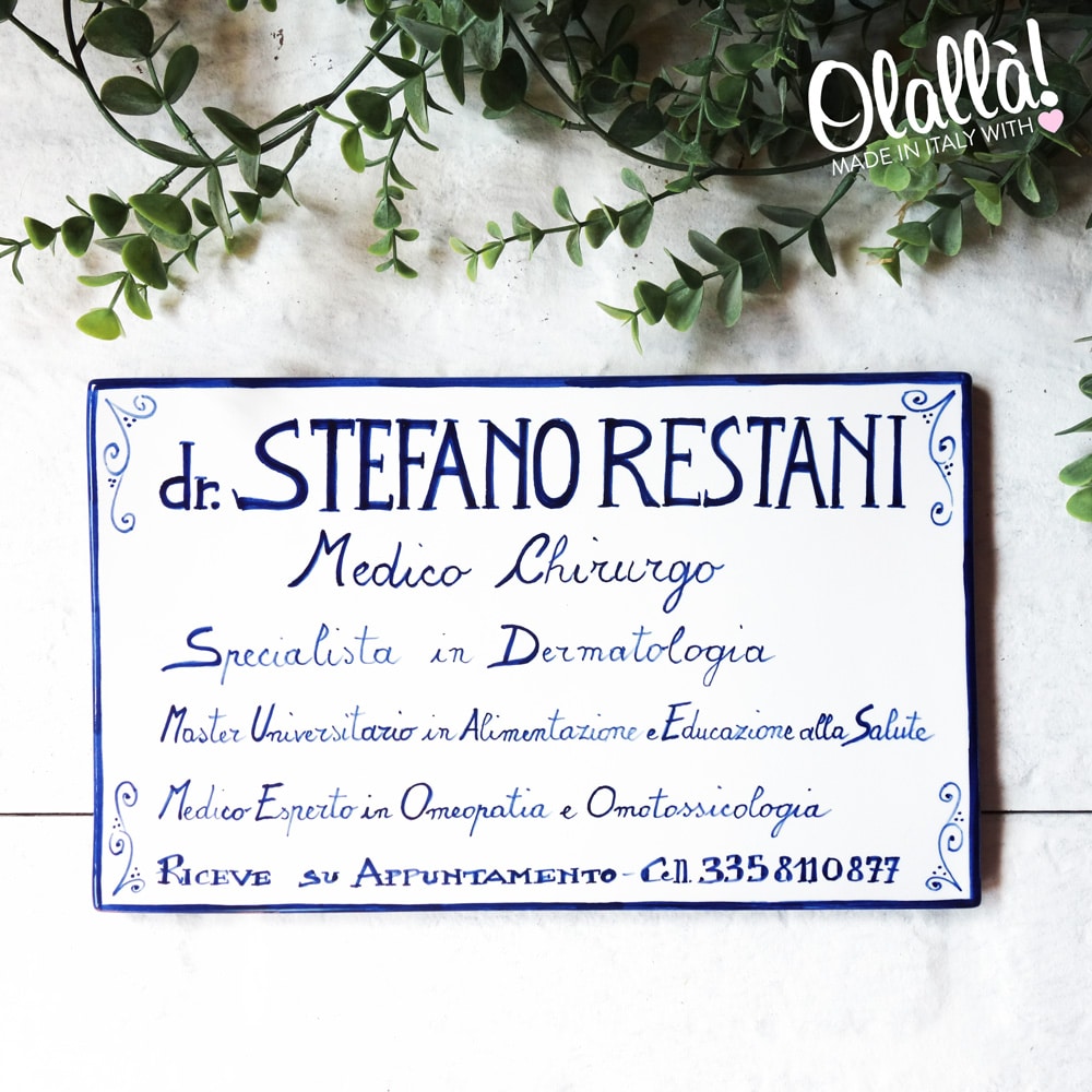 Formella con l’indicazione del nome, della professione, dei contatti e se volete dei vostri studi. E’ una targa in ceramica che vi durerà almeno 20 anni: resistenza garantita contro il gelo, sole ed intemperie. I colori potrebbero variare leggermente da quelli presenti in foto, a seconda della luce e del tipo di schermo.