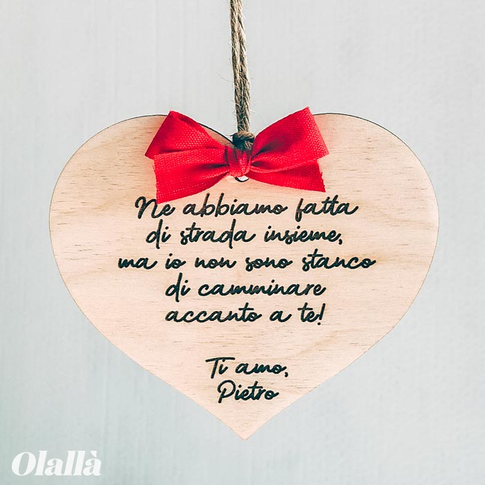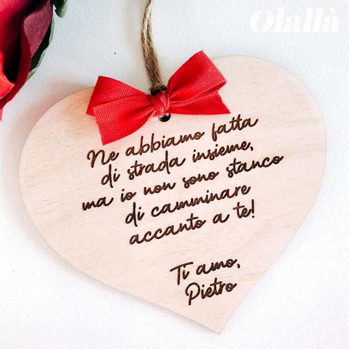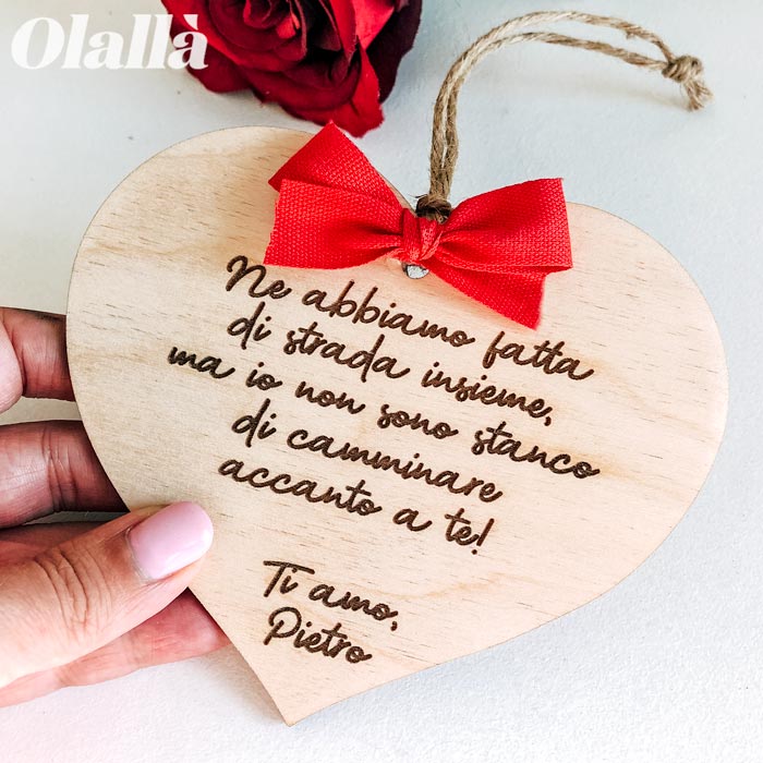 Semplice ma carica di significato, questa targhetta in legno con le tue parole incise può diventare uno splendido regalo per il vostro anniversario. Da appendere in camera o in cucina, da conservare dentro ad un cassetto, sarà per sempre una testimonianza tangibile di tutto il tuo amore per la tua dolce metà.