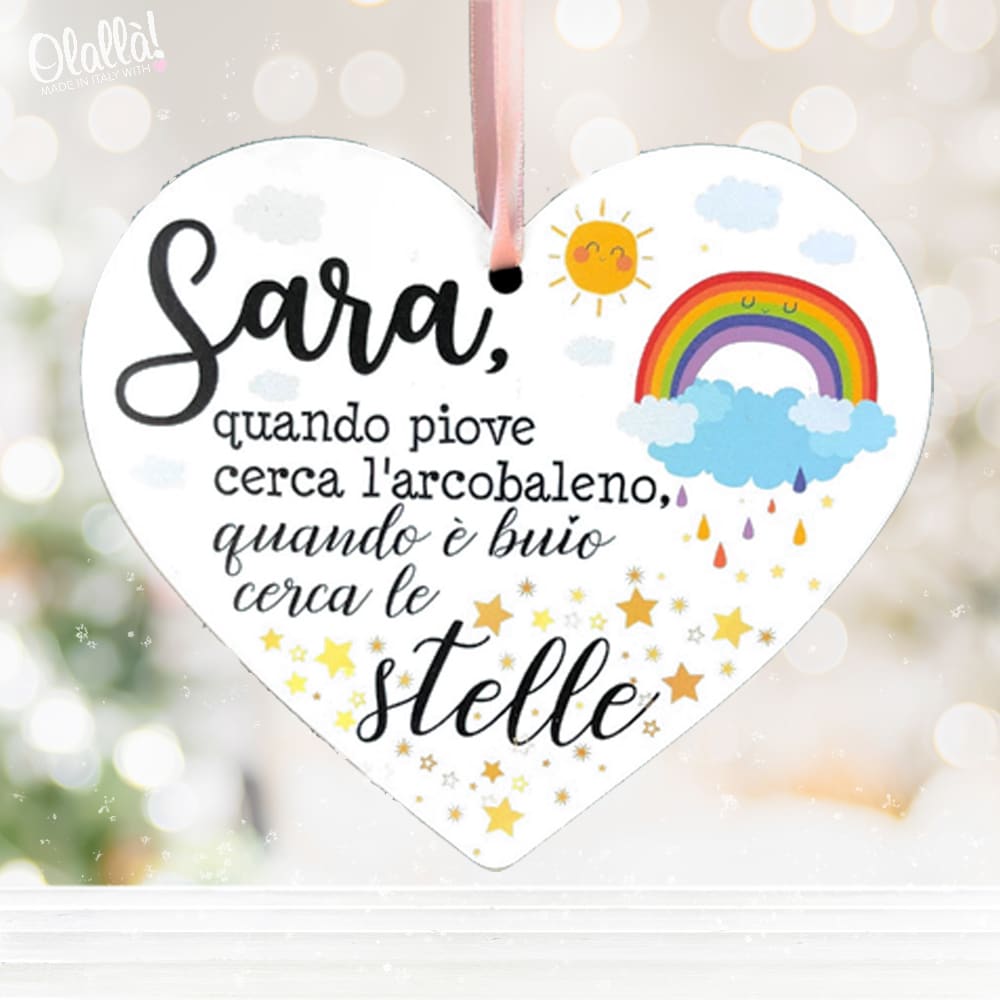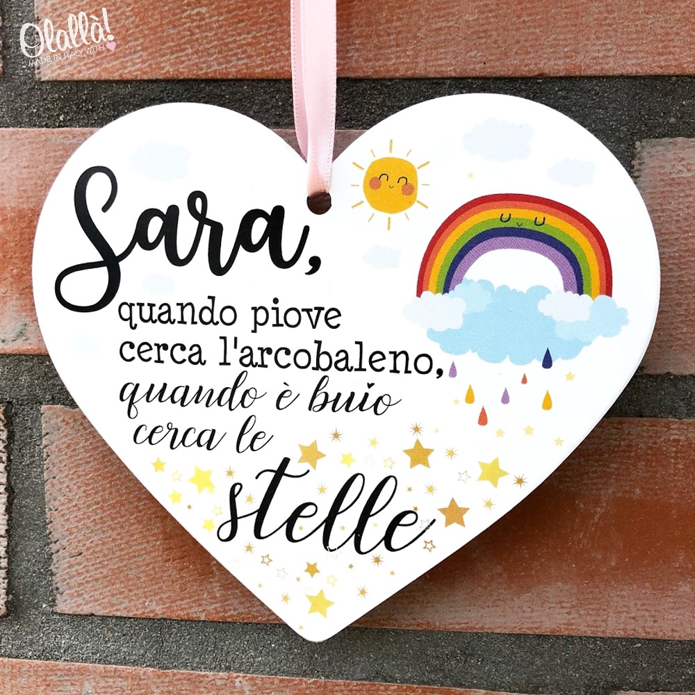 Simpatica targhetta forma di cuore con arcobaleno e stelle e messaggio di speranza a scelta. Un pensiero carino e semplice per far felice un’amica, sorella, figlia o qualsiasi persona abbia bisogno di un messaggio positivo, di speranza, incoraggiamento o vicinanza.