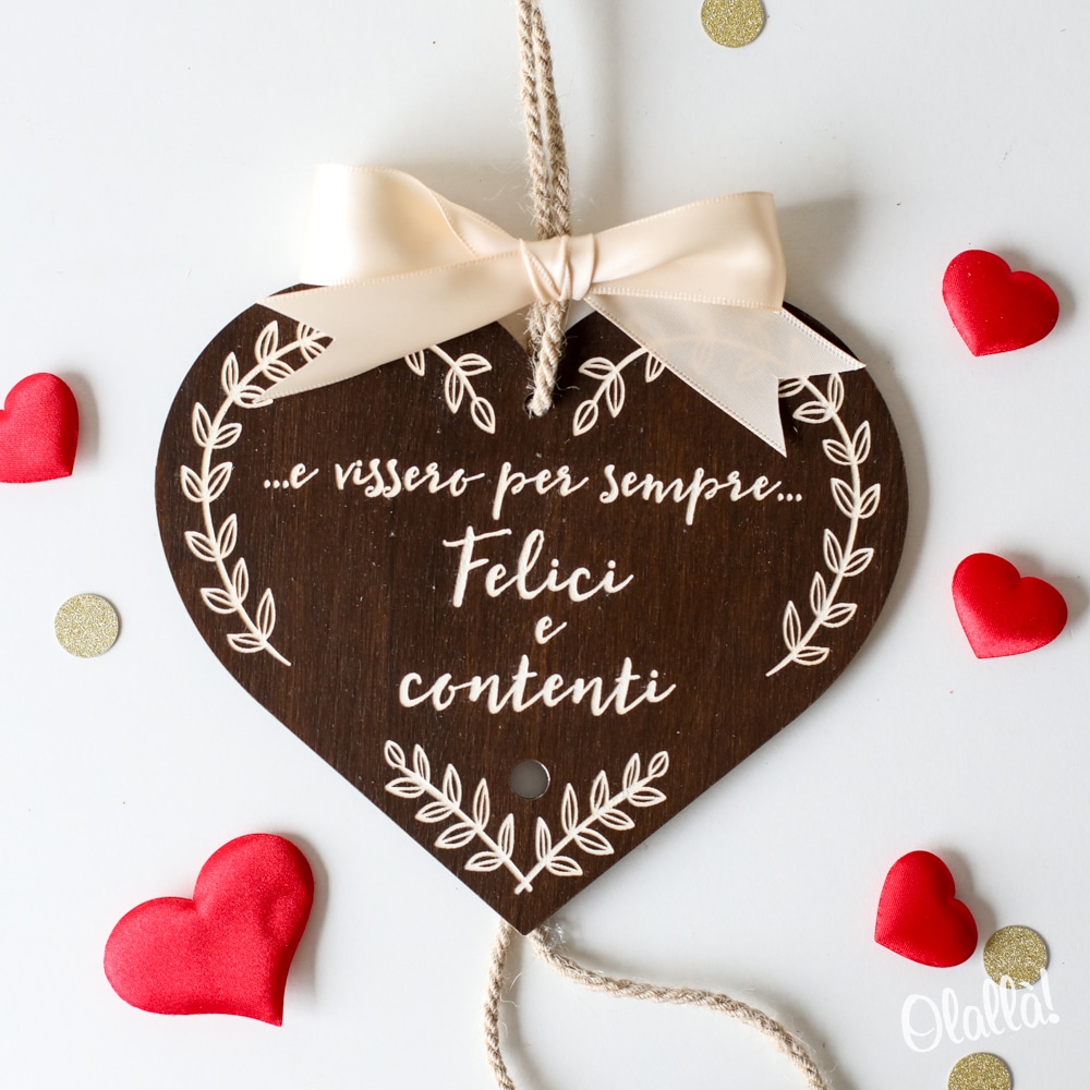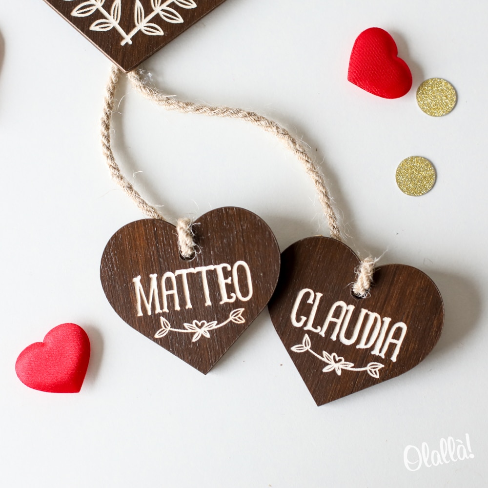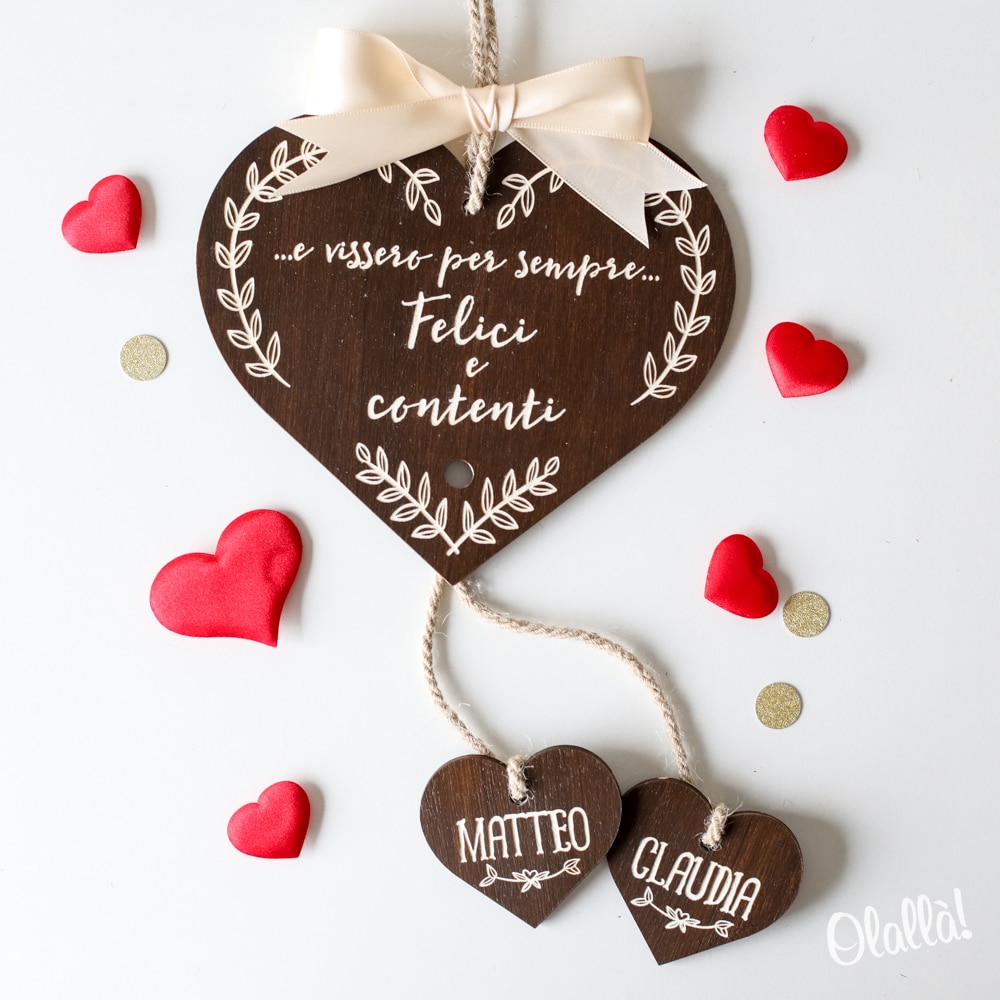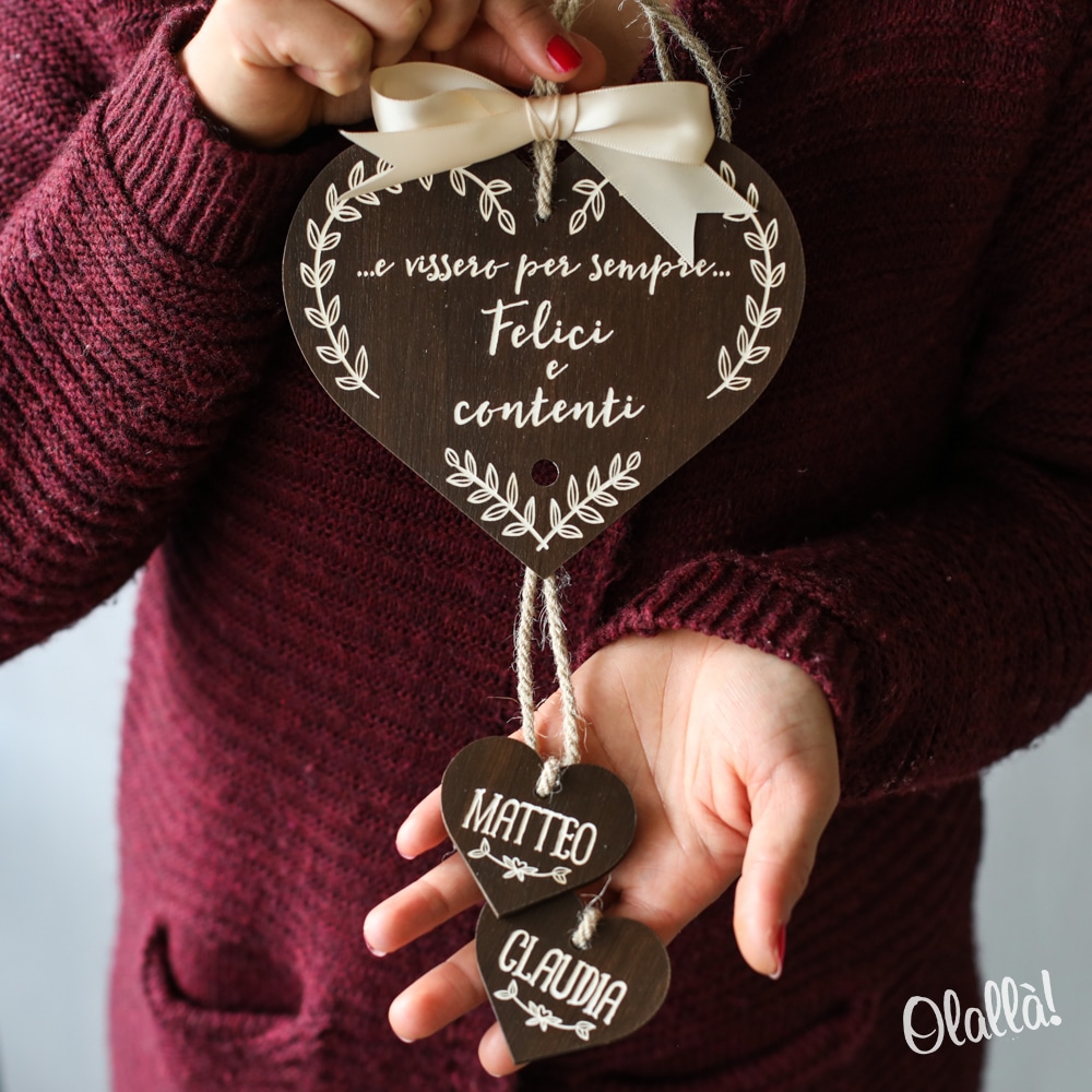 Splendida targhetta a forma di cuore in legno personalizzabile con la tua dedica, abbellita da altri due cuoricini personalizzati con i vostri nomi. Un dolce regalo d’amore per celebrare e ricordare San Valentino, il vostro anniversario o l’inizio della vostra convivenza!