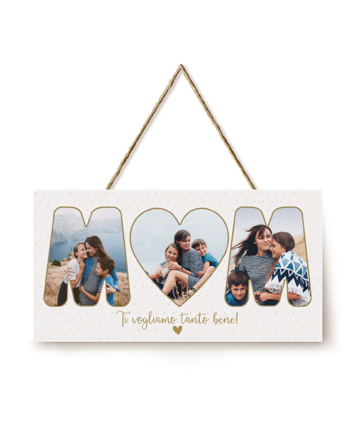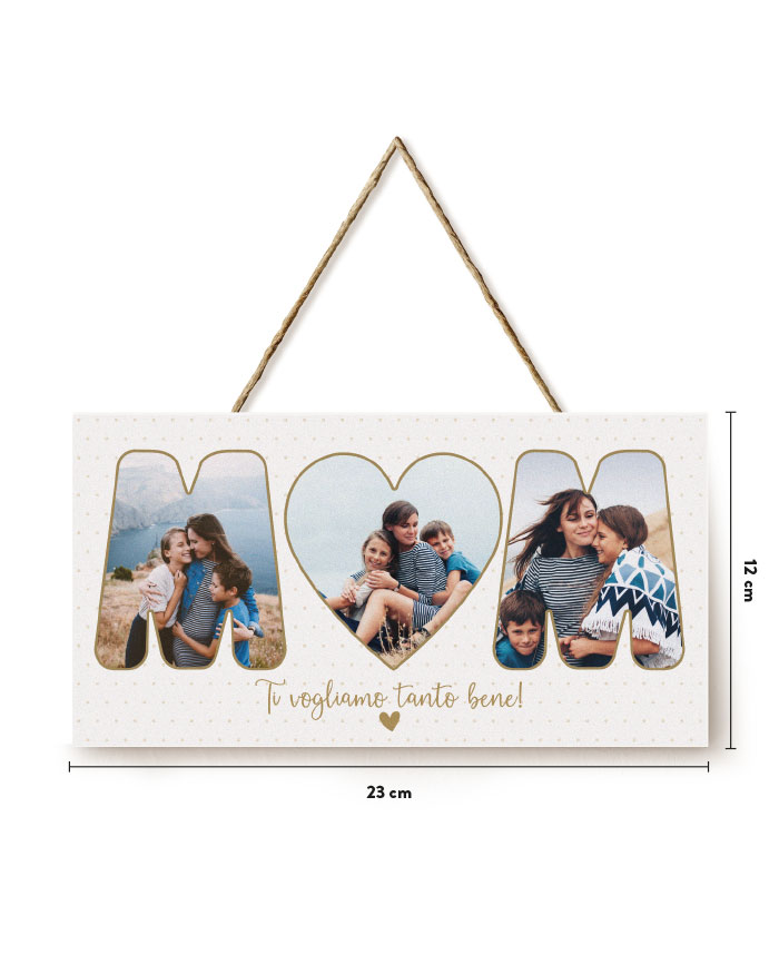 Segui le indicazioni e personalizza la targhetta con 3 foto insieme alla tua mamma che verranno inserite rispettivamente nelle lettere della parola “mom”. Infine, scrivi la tua dedica, verrà ultimata da un tenero cuoricino. ATTENZIONE: le foto devono essere luminose, centrate, con i volti ben visibili e di alta qualità.