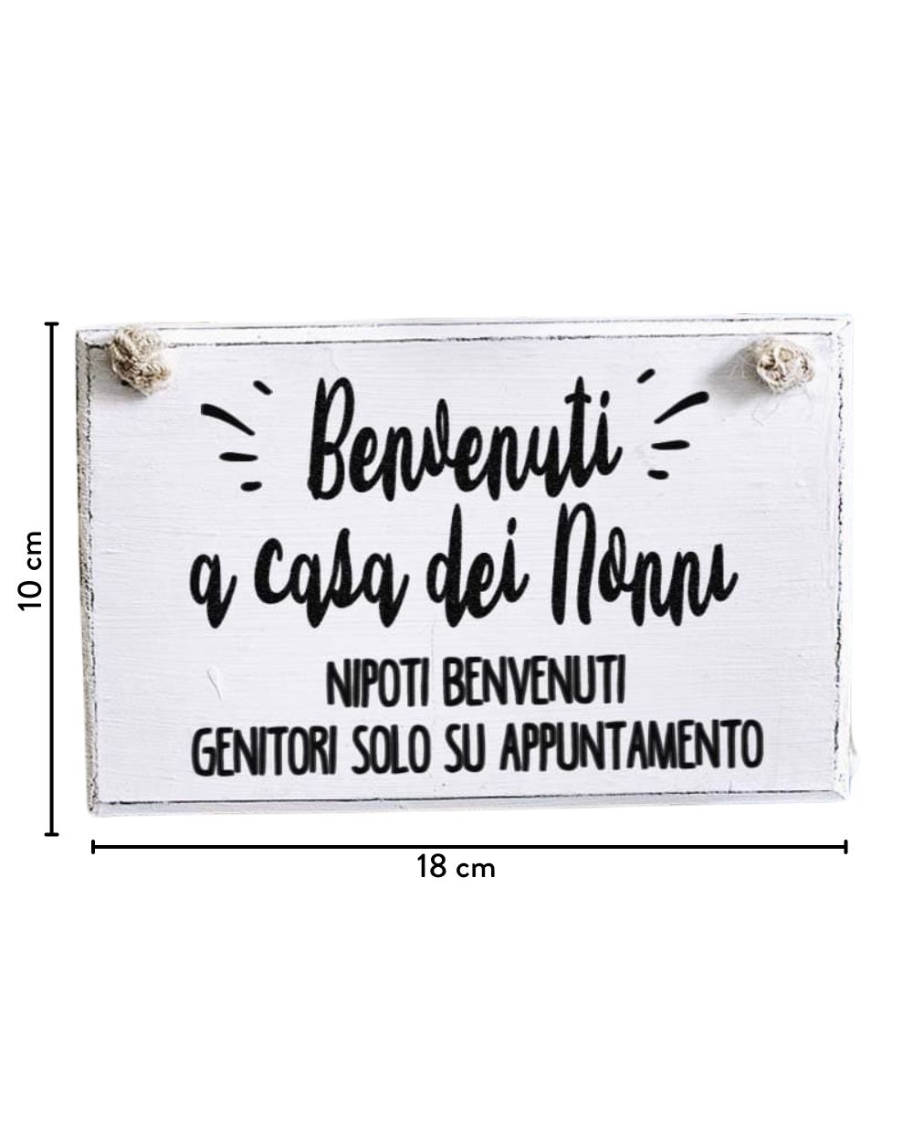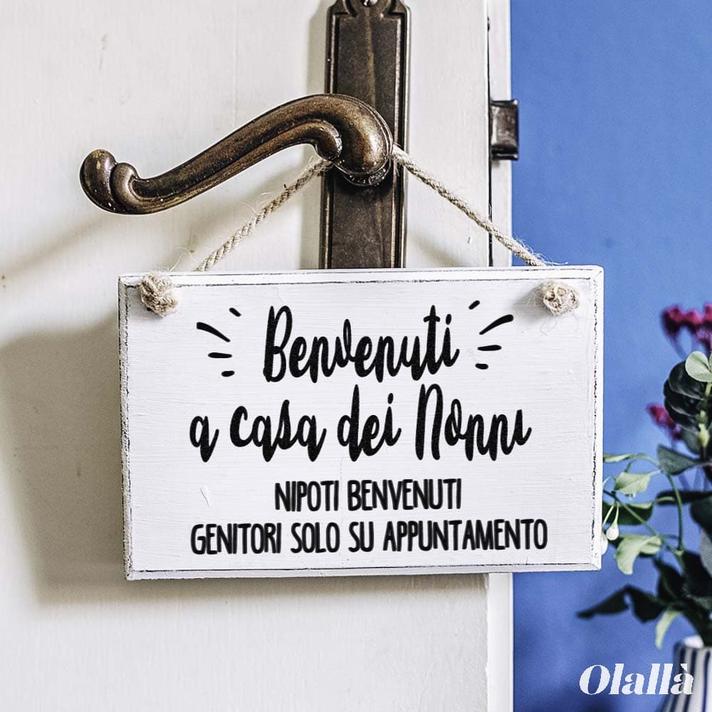 Targa in legno stile vintage personalizzata con la frase “Benvenuti a Casa dei Nonni, nipoti benvenuti genitori solo su appuntamento” modificabile a piacimento. Fai un regalo semplice ed originale ai tuoi nonni che porterà sicuramente allegria ogni volta che la leggerete!