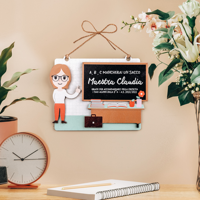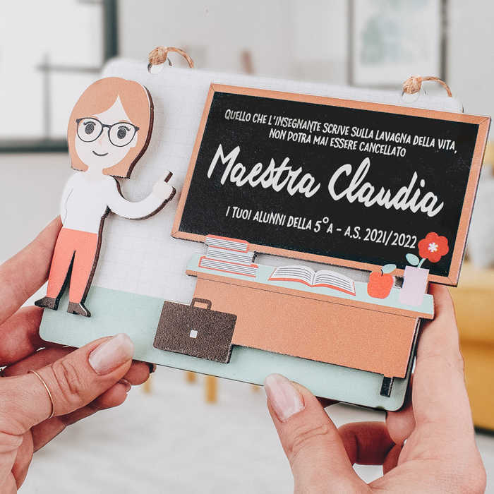 Simpatica Targhetta in Legno personalizzata con il ritratto stile caricatura del tuo insegnante preferito! Personalizza il personaggio per renderlo più somigliante alla maestra o al maestro, e inserisci la tua dedica sulla lavagna: creerai così una targhetta unica e speciale che difficilmente sarà dimenticata dall’insegnante che la riceverà! Questo è un regalo perfetto per salutare un insegnante che va in pensione oppure come regalo per le maestre in occasione della fine dell’anno.
