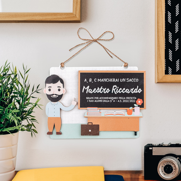 Simpatica Targhetta in Legno personalizzata con il ritratto stile caricatura del tuo insegnante preferito! Personalizza il personaggio per renderlo più somigliante alla maestra o al maestro, e inserisci la tua dedica sulla lavagna: creerai così una targhetta unica e speciale che difficilmente sarà dimenticata dall’insegnante che la riceverà! Questo è un regalo perfetto per salutare un insegnante che va in pensione oppure come regalo per le maestre in occasione della fine dell’anno.