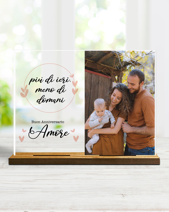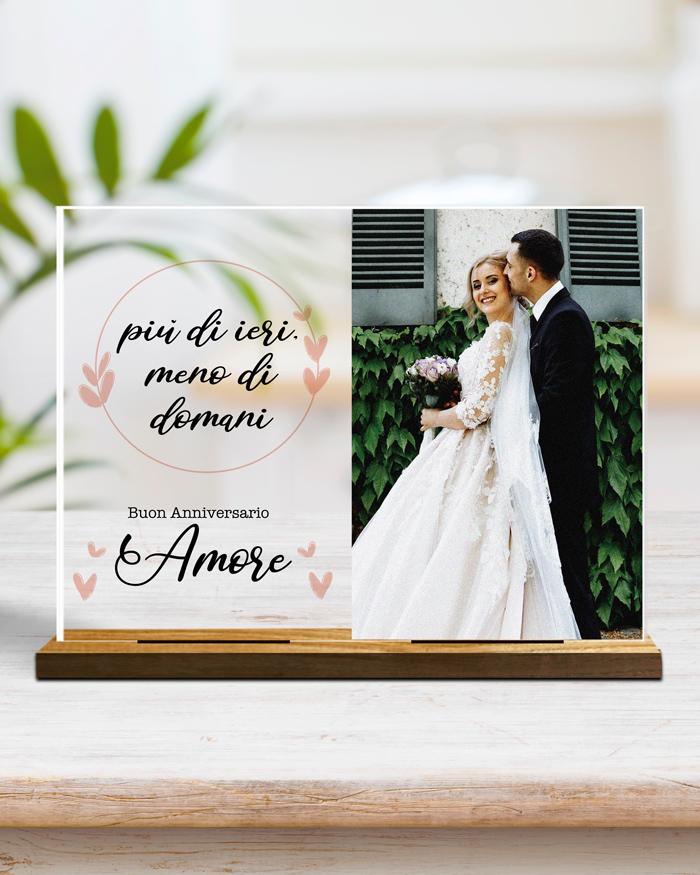 Bellissima targhetta personalizzata con la foto che desideri e la dedica “Più di ieri, meno di domani”. Con questa targhetta, il tuo regalo per l’anniversario sarà indimenticabile ed emozionerà sicuramente il tuo partner.