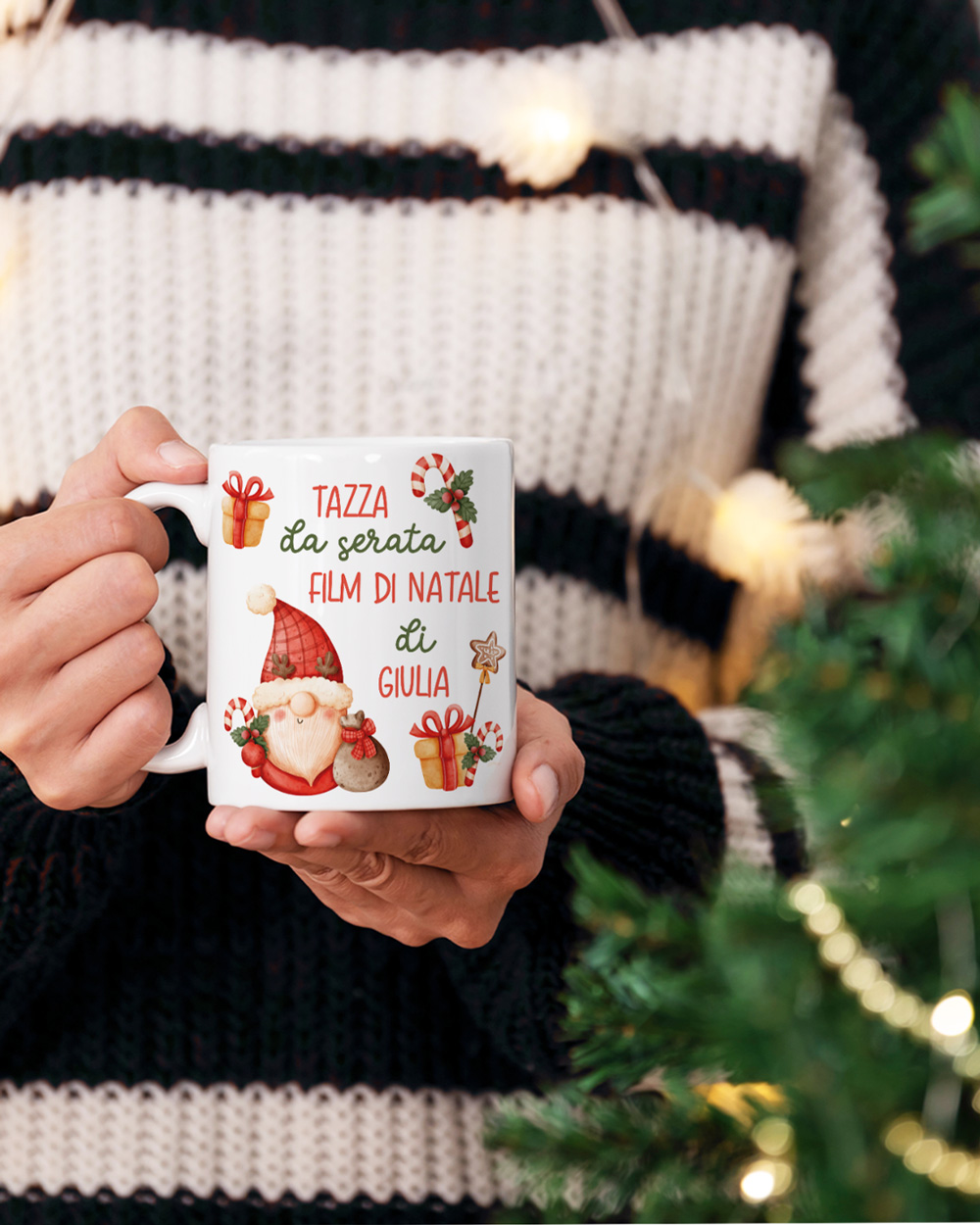 Può essere personalizzata con una breve frase (es. “Tazza Serata film di Natale di Giulia”).