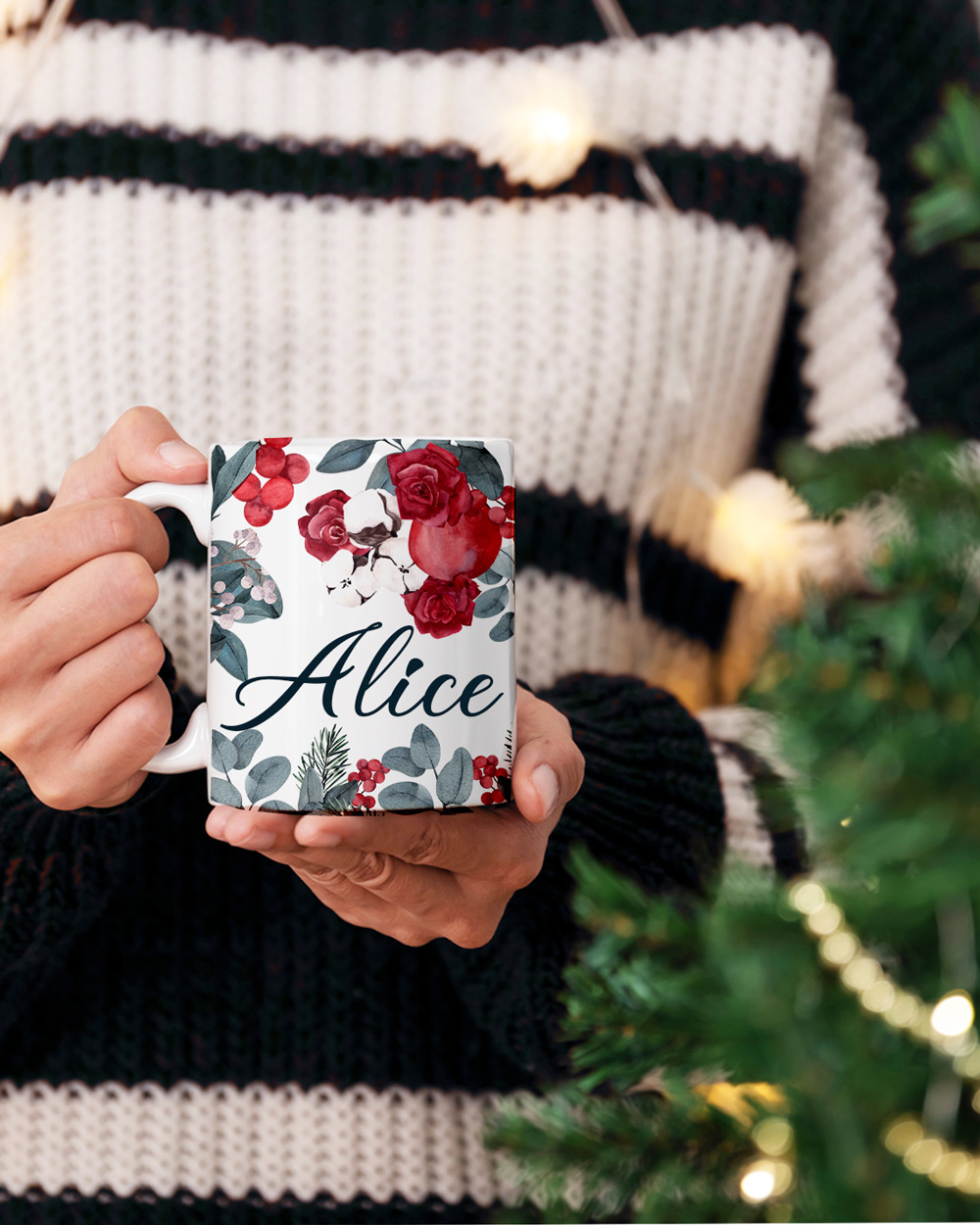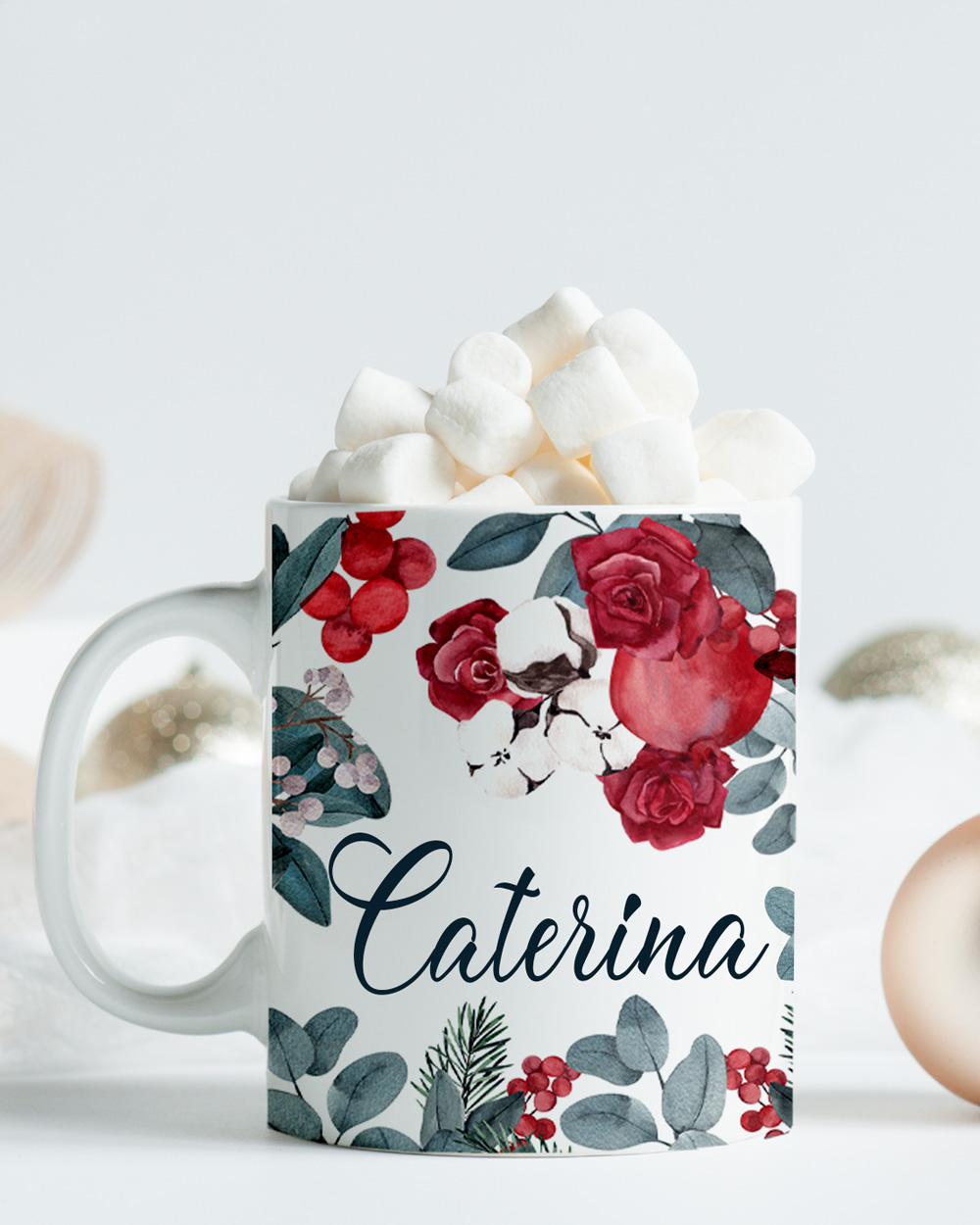 Deliziosa tazza mug in ceramica personalizzabile, decorata a tema floreale. Perfetta per tè, tisane e cioccolata calda, da utilizzare durante le giornate più fredde per regalare ai tuoi cari dolci momenti natalizi.