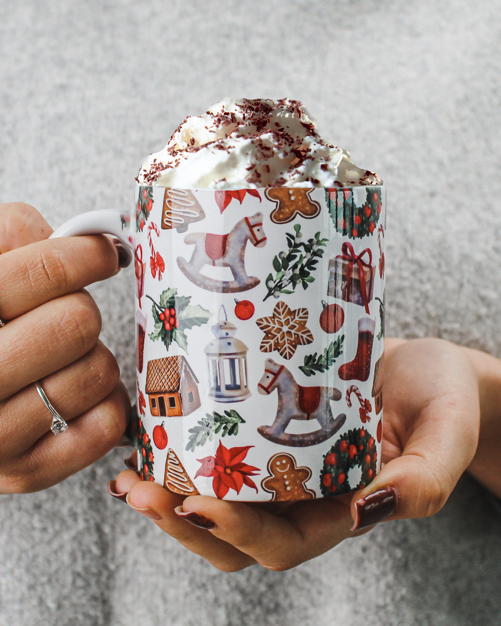 Simpaticissima tazza mug in ceramica, abbellita con decorazioni natalizie: pacchi regalo, giocattoli, ghirlande, omini di pan di zenzero… Da regalare durante il periodo natalizio a chi più ti sta a cuore per invitarlo a bere insieme una tazza calda di tisana o di cioccolata.