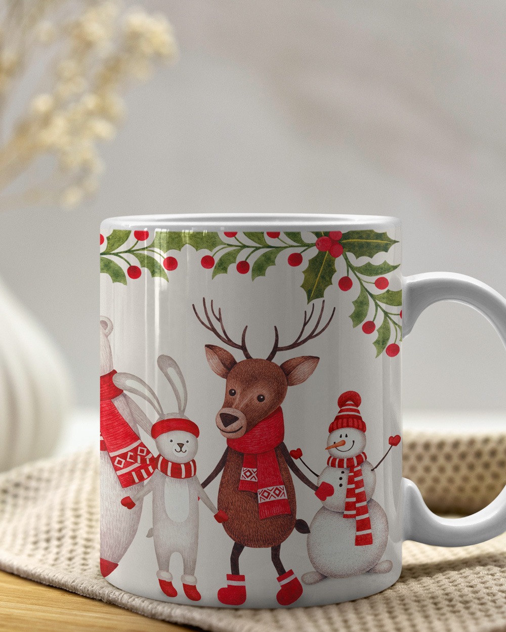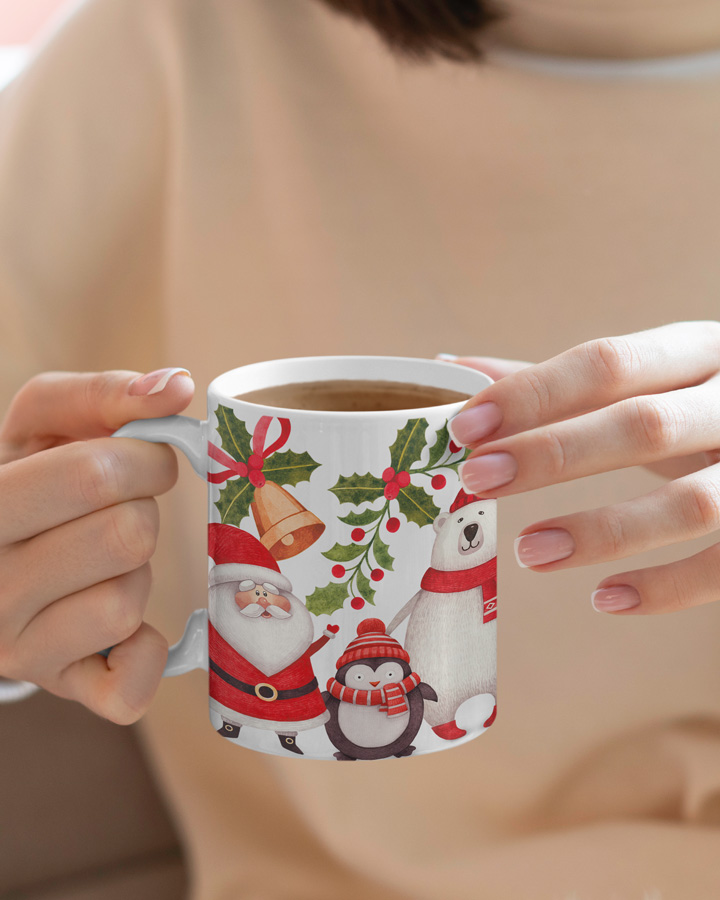 Simpaticissima tazza mug in ceramica decorata con personaggi a tema natalizio: Babbo Natale, un orso polare, un pinguino, una renna…Perfetta per tutta la famiglia, per condividere un momento insieme gustando una cioccolata calda o una buona tazza di the.