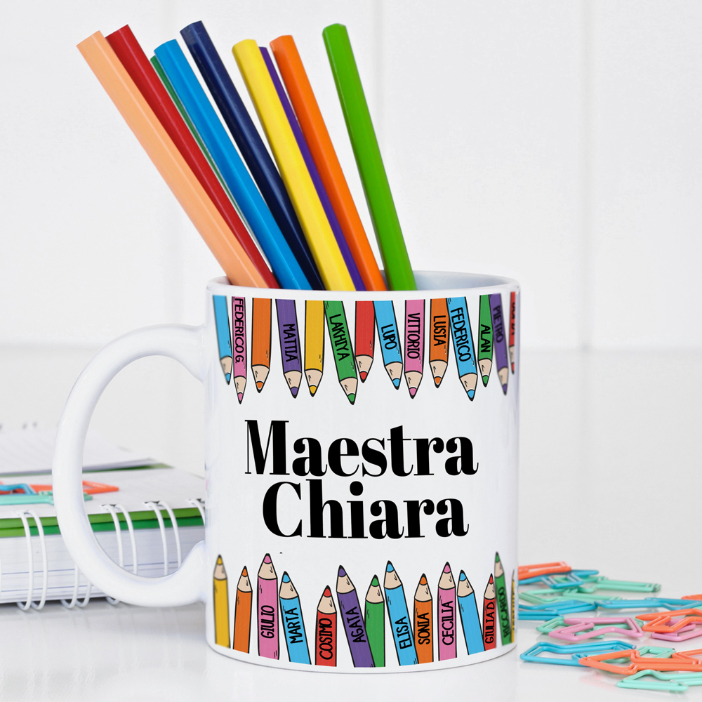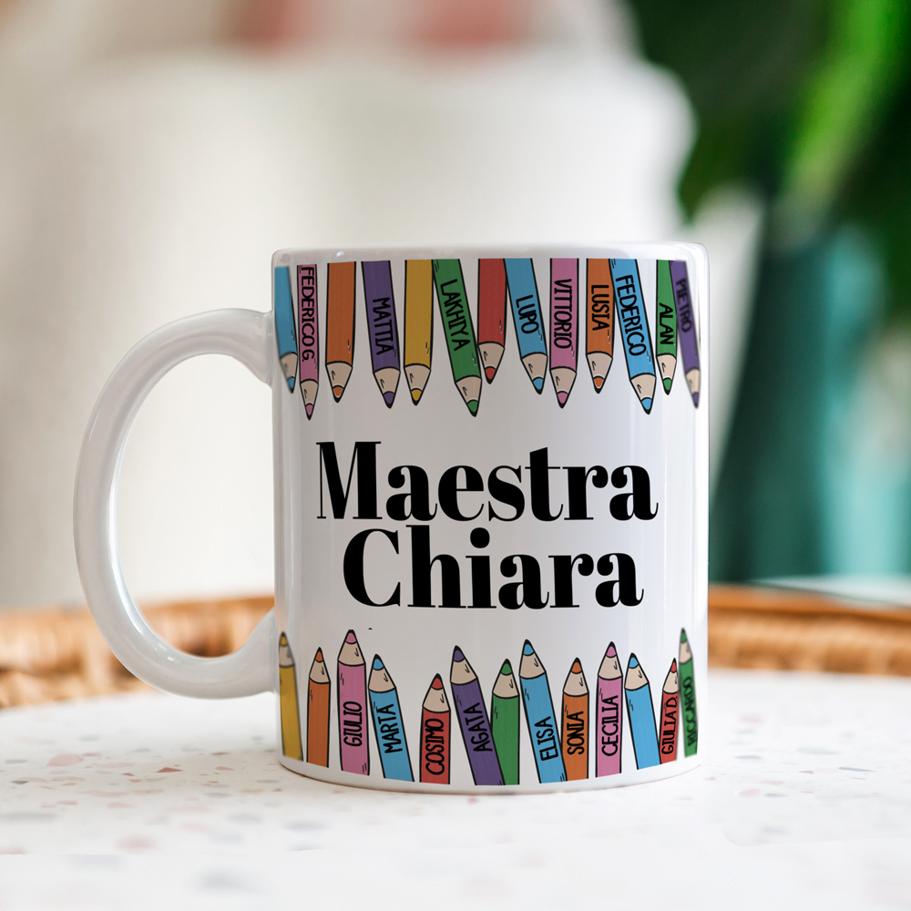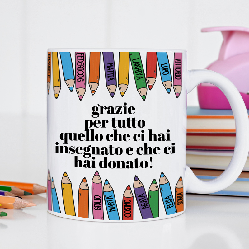 Questa bellissima tazza è personalizzabile con i nomi degli alunni fino a 26 nomi.