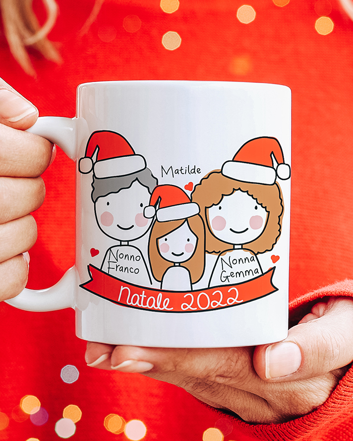 Tazza in ceramica personalizzata con omini stilizzati natalizi che riprendono le fattezze dei vostri nonni, nipoti o famiglie, i loro nomi e una dedica sul retro. Un regalo unico che accompagnerà i vostri affetti più cari durante i freddi mesi invernali con un tocco di amore in più!