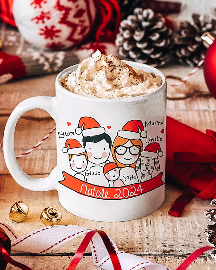 La tazza può essere personalizzata inserendo quanti soggetti desiderate, per un massimo di 5, compresi cani o gatti! Potete ulteriormente scegliere il colore dei capelli e la frase personalizzata sotto ciascun personaggio. A scelta è possibile aggiungere occhiali e barba/baffi ad ogni omino. La tazza è personalizzabile con una dedica sul retro. Il cappellino rosso natalizio viene applicato di default a tutti gli omini.