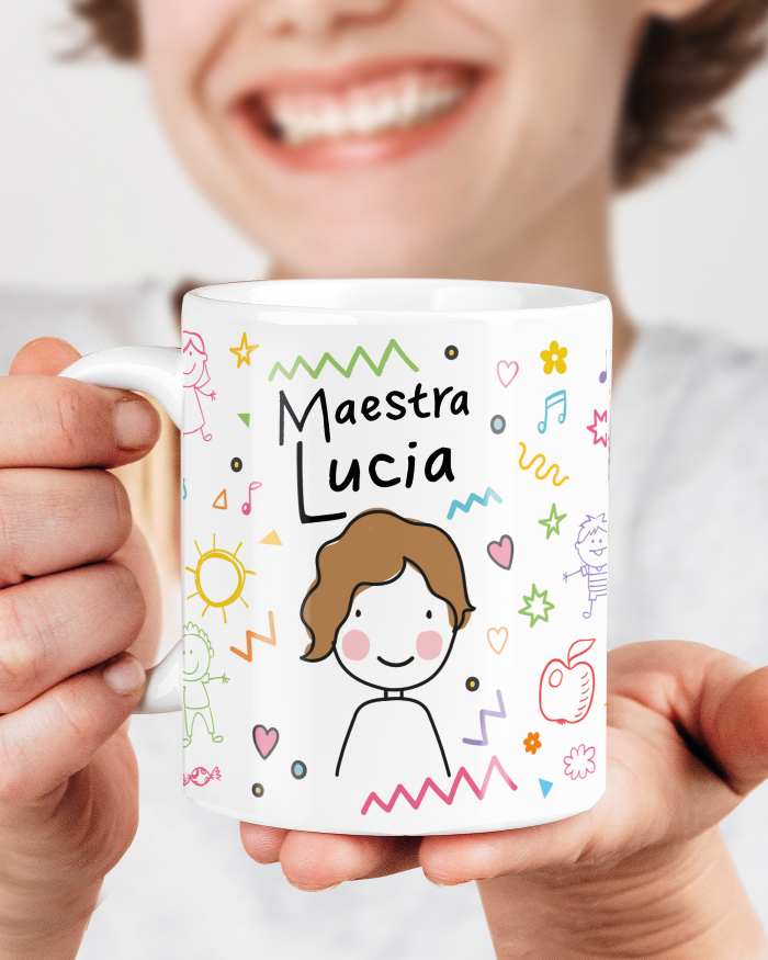Meravigliosa tazza in ceramica personalizzabile con un omino stilizzato che riproduce le sembianze della vostra amata maestra d’asilo, Dada, completata con il suo nome e una dolce dedica sul retro.