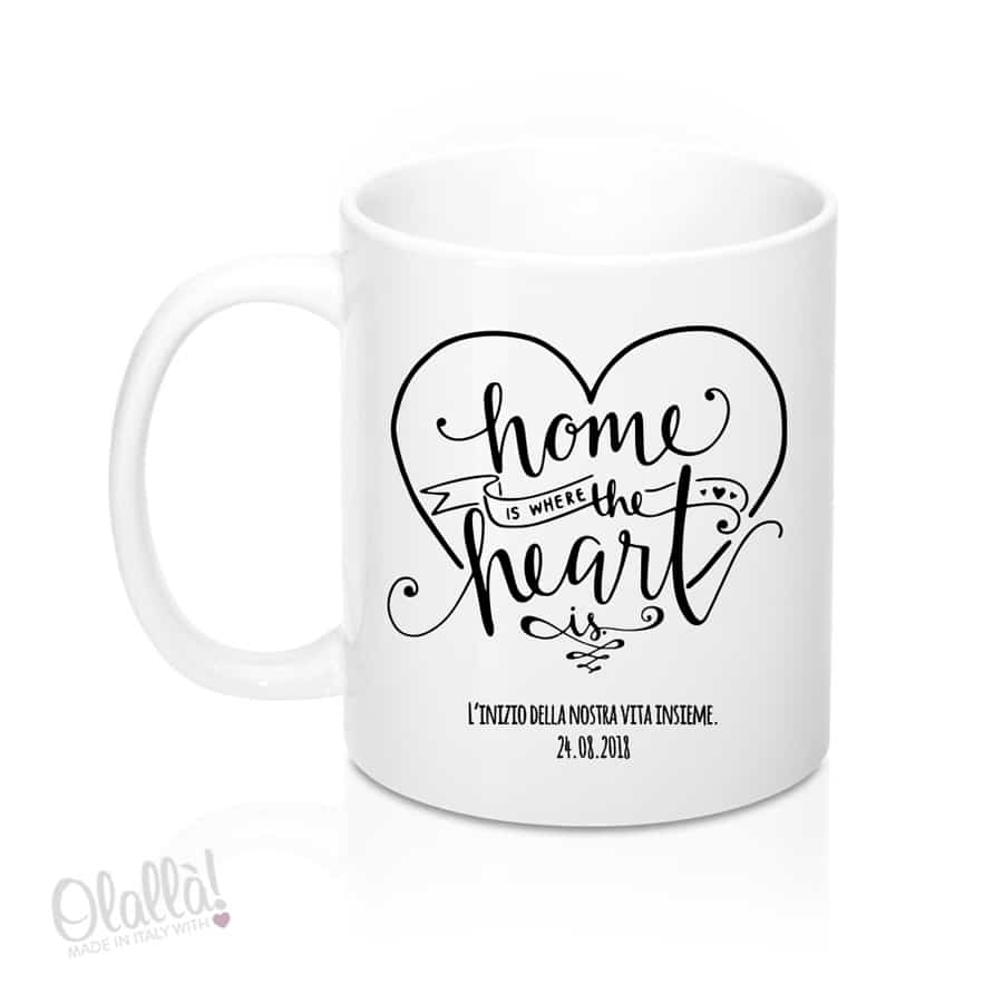 Dolcissima tazza in ceramica, con stampa molto romantica “Home is where the heart is” (“La casa è dove risiede il cuore”), realizzata con la tecnica della termosublimazione. Puoi personalizzarla come più preferisci, scegliendo una frase diversa e aggiungendo magari una dedica sul retro. Può essere un’idea regalo molto carina, ma anche un’idea originale per una bomboniera, specialmente mantenendo la frase “L’inizio della nostra vita insieme”, inserita subito sotto quella citata in precedenza, e la data del vostro matrimonio.
