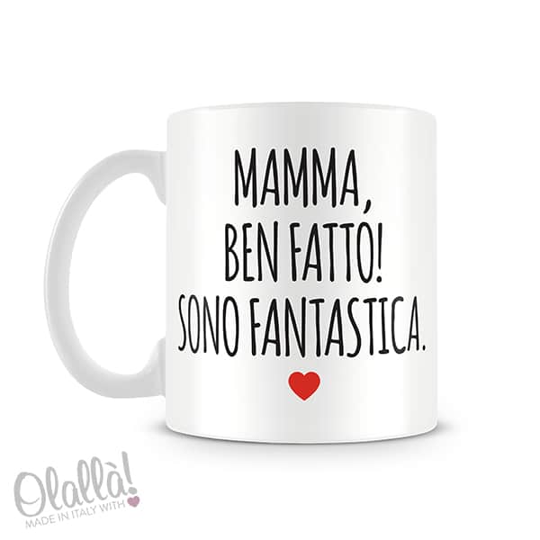 Originalissima tazza personalizzata con la frase “Mamma ben fatto! Sono fantastica”.Una simpaticissima idea regalo per la festa della mamma. Per rendere il regalo ancora più speciale sul retro della tazza potete scrivere la vostra dedica a scelta.