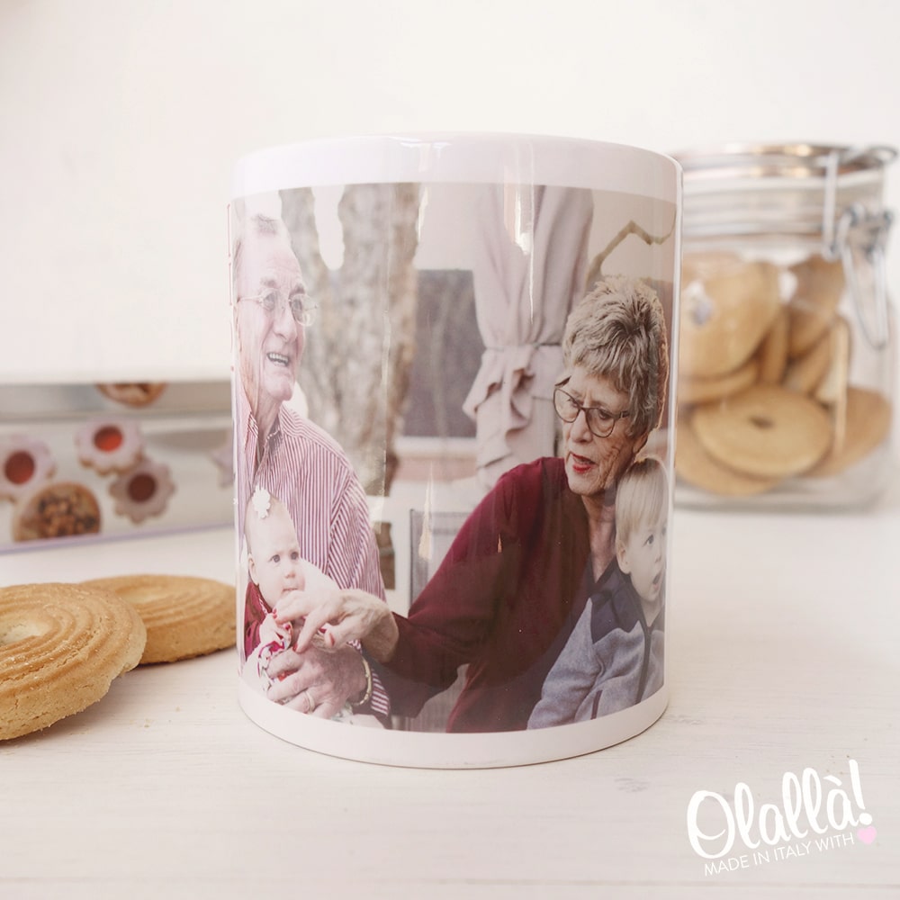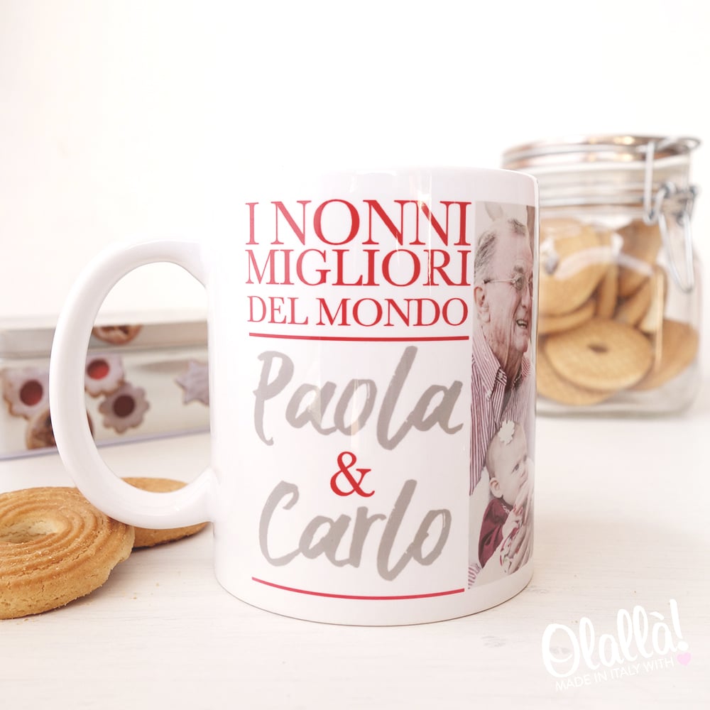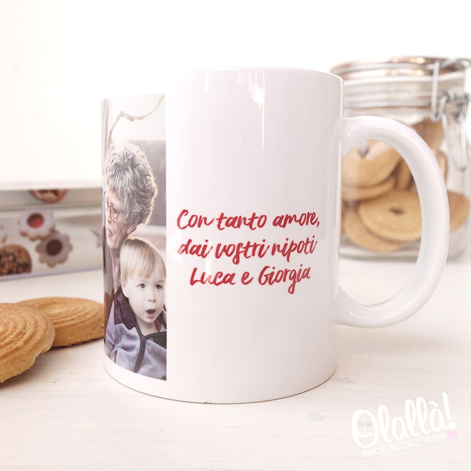 Simpatica tazza in ceramica, personalizzata artigianalmente con la tecnica della termosublimazione, personalizzabile con nomi, un messaggio, una vostra foto e una dedica, ideale come regalo per i vostri nonni in occasione della Festa dei Nonni o per il loro compleanno o per Natale. L’elaborazione grafica è inclusa nel prezzo, e con l’aggiunta di solo 1€ puoi visionarla in anticipo.