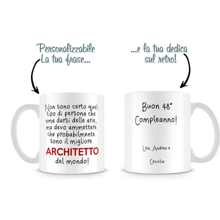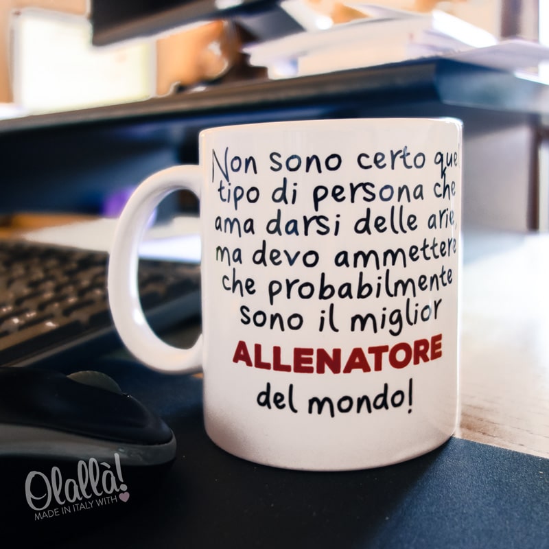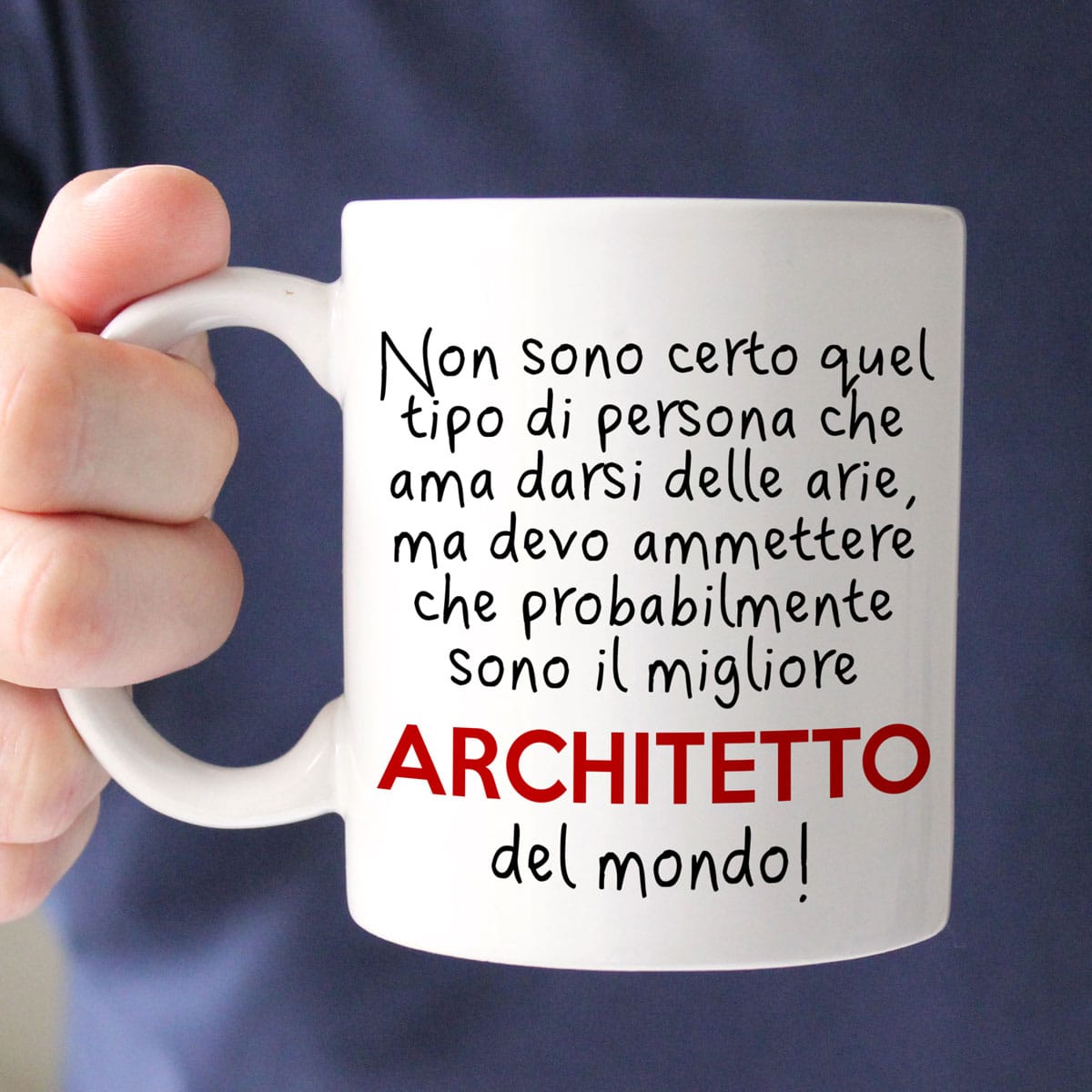 Simpatica tazza idea regalo per tutti coloro che godono di una sana e robusta autostima! La frase “Non sono certo quel tipo di persona che ama darsi delle arie, ma devo ammettere che probabilmente sono il migliore…  del mondo!” viene personalizzata con la professione o il lavoro del destinatario del vostro regalo, ma può anche essere personalizzata con “Mamma” o “Papà”, “Nonno” etc. Per rendere il regalo ancora più speciale sul retro della tazza potete scrivere la vostra dedica a scelta.  Tazza in ceramica made in Italy, stampata artigianalmente in un laboratorio artigiano italiano. Elaborazione grafica inclusa nel prezzo.