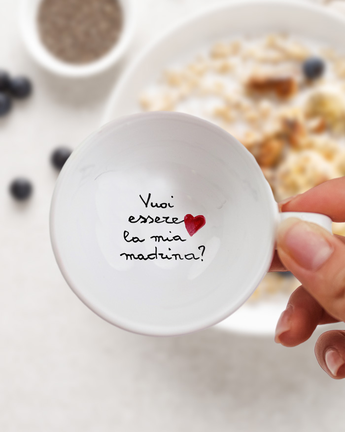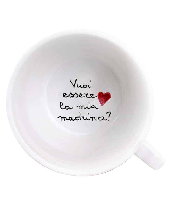 Tazzina in ceramica con messaggio segreto dipinto a mano sul fondo “Vuoi essere la mia madrina?” in colore nero con cuoricino rosso.