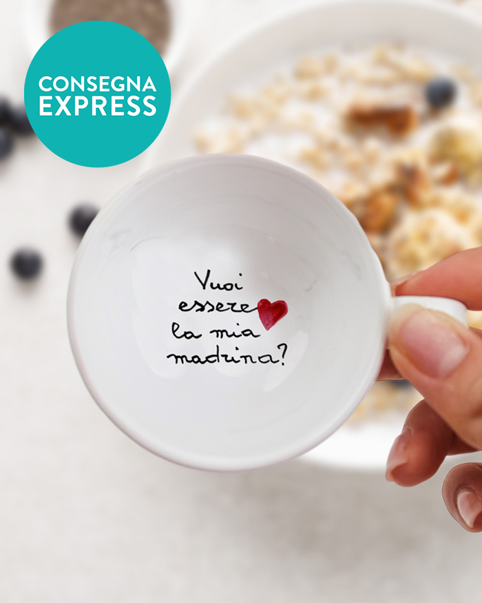 Una tazzina personalizzata è un regalo perfetto per ricordare a chi la riceverà quanto ci tieni e l’importanza che le dai chiedendole di essere la madrina di tuo figlio in occasione della sua Cresima o del suo Battesimo. Si ricorderà di questo bellissimo gesto ogni giorno! Preparale un buon caffè servito su questa tazzina…quando arriverà alla fine, leggerà il tuo messaggio…una dolcissima sorpresa e un piacevole modo anche per far iniziare bene la giornata alla tua persona del cuore!