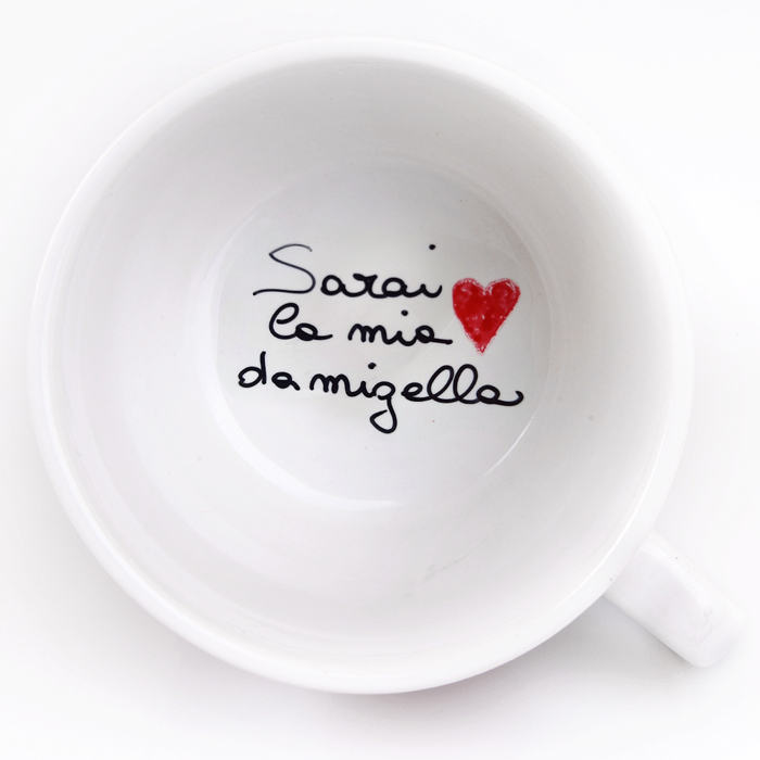 Le decorazioni di queste originali tazze sono i vostri pensieri, le cose importanti che volete dire o chiedere, in un modo originale e indimenticabile, alle persone che vi stanno a cuore…. “vuoi sposarmi?” oppure “diventerai nonna” ma anche “papà, Claudio e io ci sposiamo”, o perché no “mamma papà venite alla mia laurea”, “amore mio aspettiamo un bambino” “sorpresa, sono due gemelli…”
