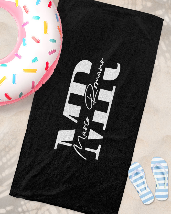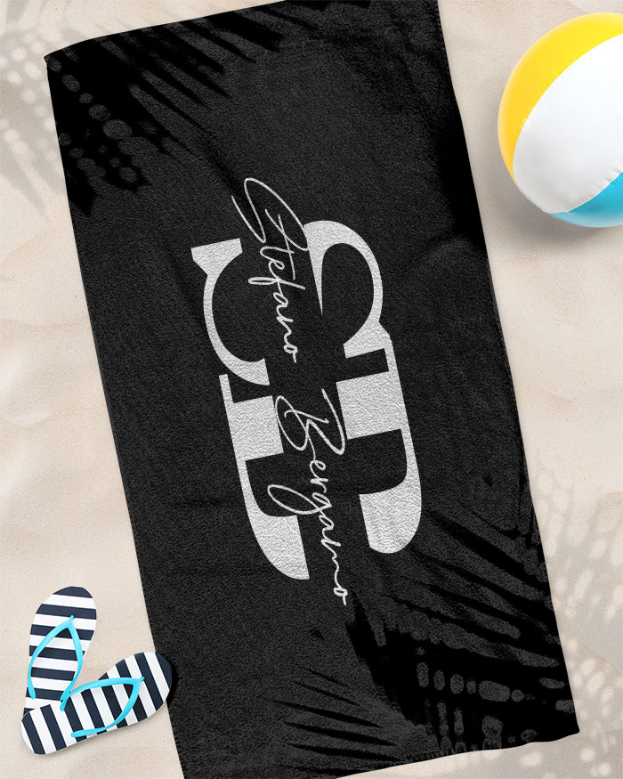 Elegante Telo Mare in colore Nero Personalizzato con Nome ed Iniziali maiuscole. Fai uno splendido regalo al tuo amico o uomo prima della partenza per le vostre vacanze al mare oppure per il compleanno! In morbida spugna stampata. Dimensioni 90×150 cm.