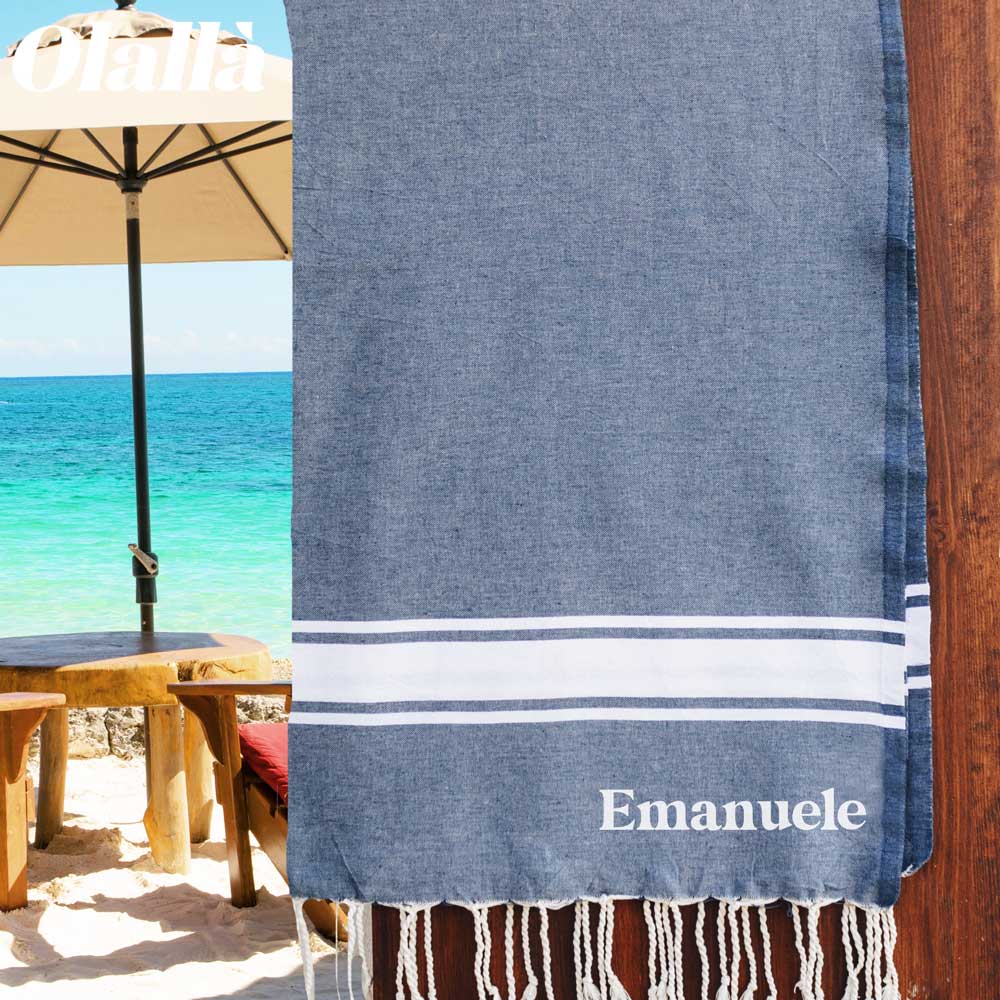 Recensisci per primo “Telo Mare Fouta Blue Jeans con Riga 100 % Cotone Personalizzato con Stampa o Ricamo del Nome” Annulla risposta