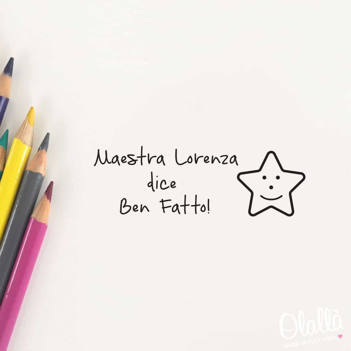 Timbro personalizzato con il nome della maestra e la frase “dice ben fatto!” più il disegno di una stellina sorridente. Ideale per rendere felici gli alunni più meritevoli con un’approvazione davvero speciale, un modo elegante e veloce per far conoscere la propria soddisfazione. Simpatica idea regalo per una collega maestra o per decorare con stile piccoli regali per i vostri alunni.
