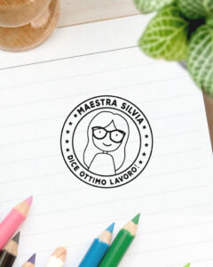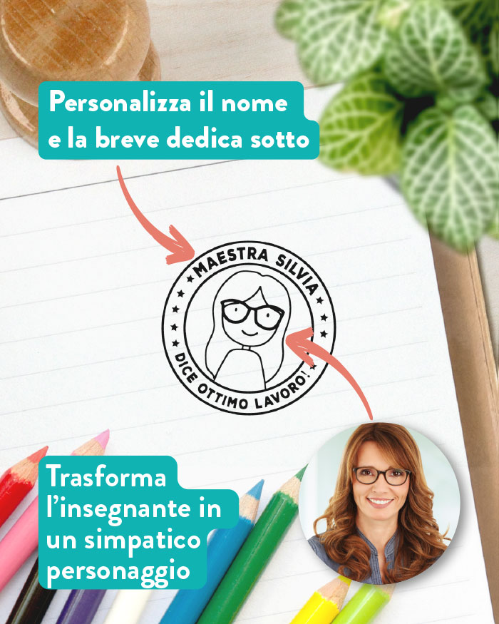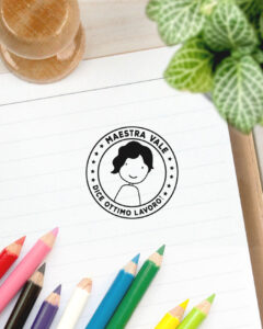 Timbro personalizzato con il disegno stilizzato della maestra e il suo nome più la frase “Dice ottimo lavoro!”
