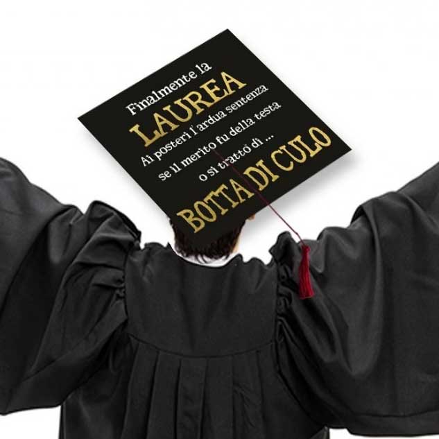 Tocco originale per festeggiamenti di laurea davvero speciali! Sul tradizionale copricapo che si indossa alla laurea è stampata la frase “Finalmente la laurea ai posteri l’ardua sentenza se il merito fu della testa o si trattò di botta di culo”. Ideale per celebrare tra le risate l’agognato traguardo del neo dottore!