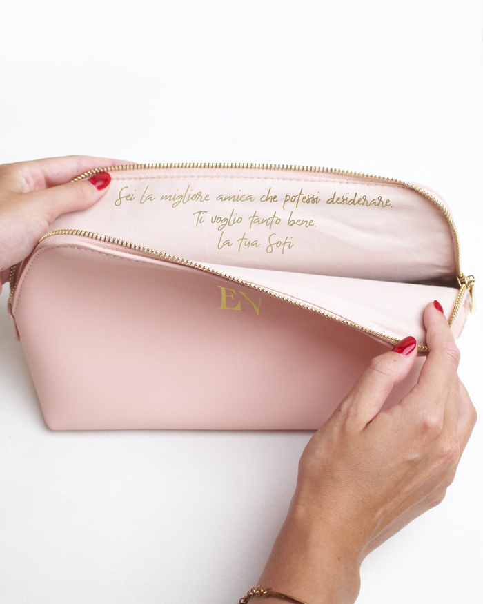 Beauty case trousse personalizzata in ecopelle con iniziali. Chiusura con zip di metallo dorato.