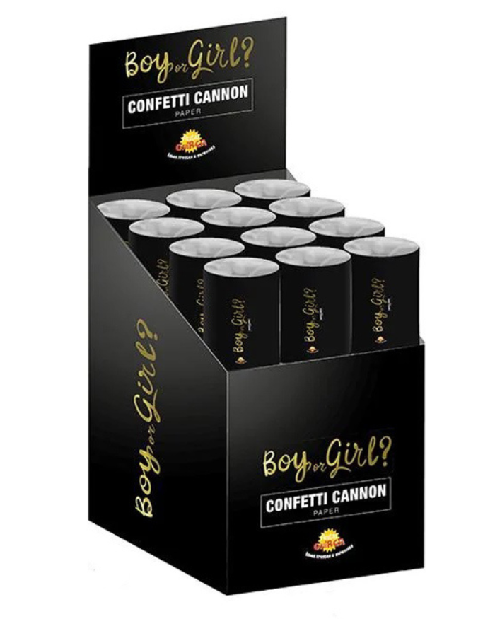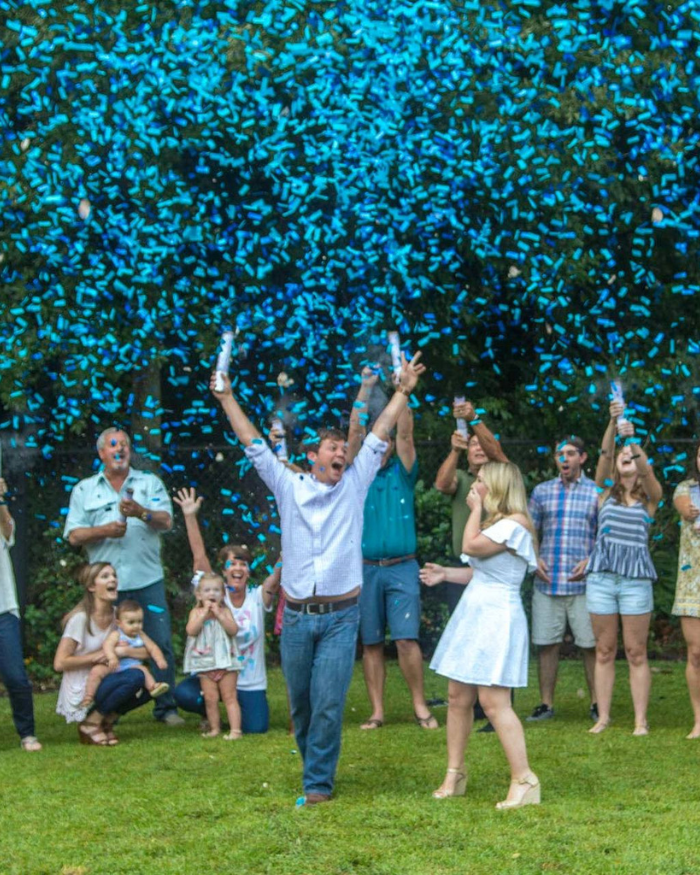 Simpaticissimo tubo spara coriandoli di colore azzurro e oro, perfetto da usare al tuo gender reveal party. Sorprendi tutti gli invitati con una pioggia di coriandoli azzurro e oro per rivelare loro che sta per arrivare al mondo un nuovo bimbo!