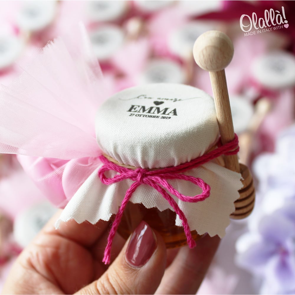 Dolcissimi vasetti di miele di produzione artigianale adatti come bomboniera per i vostri invitati o segnaposto al tavolo. Perfetti come bomboniera di battesimo, comunione, cresima o in occasione di una nascita. In questo modello il coprivasetto è in cotone avorio personalizzato con le vostre parole, ed il cordino è in rafia in colori a scelta. Il formato del vasetto a scelta tra le varie opzioni. Il miele è a scelta tra acacia (più chiaro) e millefiori (più scuro). Risparmia sulla quantità: scopri come varia il prezzo se ordini più vasetti! Oppure, scegli di confezionare a casa da solo il tuo miele…in questo caso le tue bomboniere diventeranno ancora più economiche!