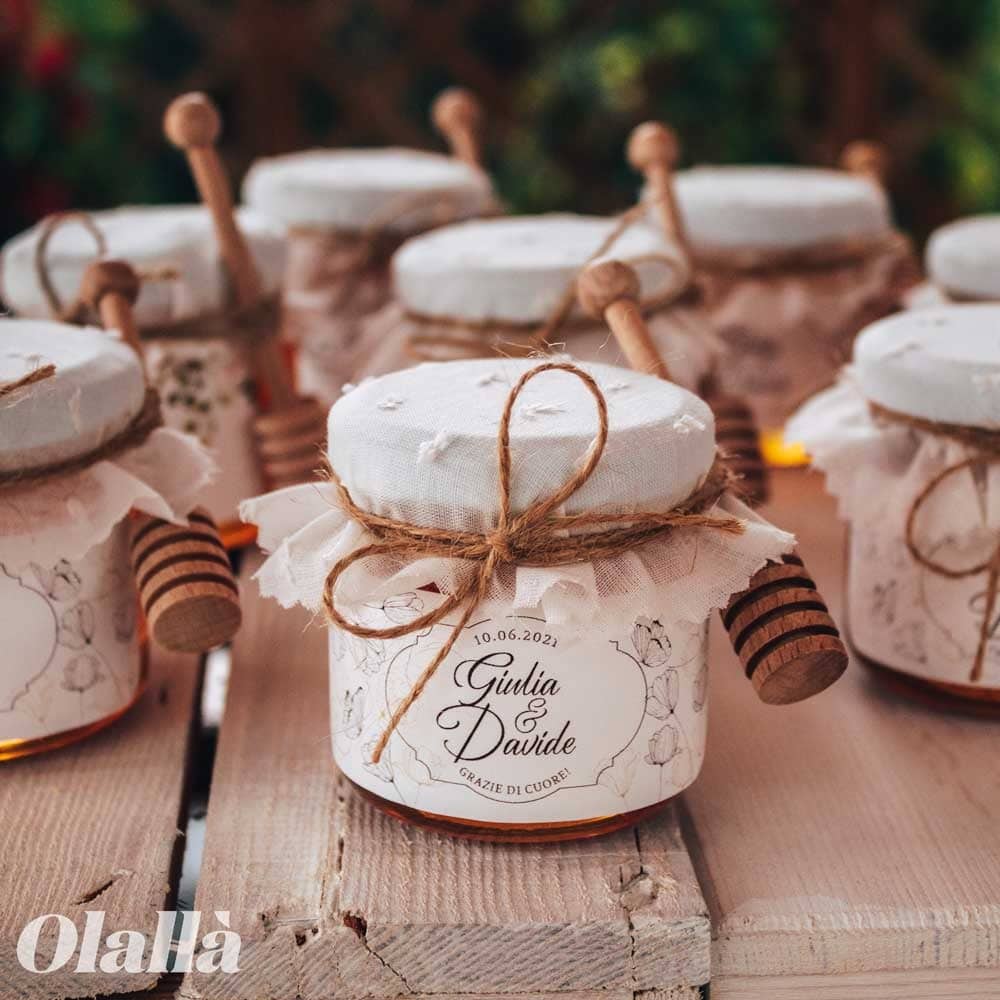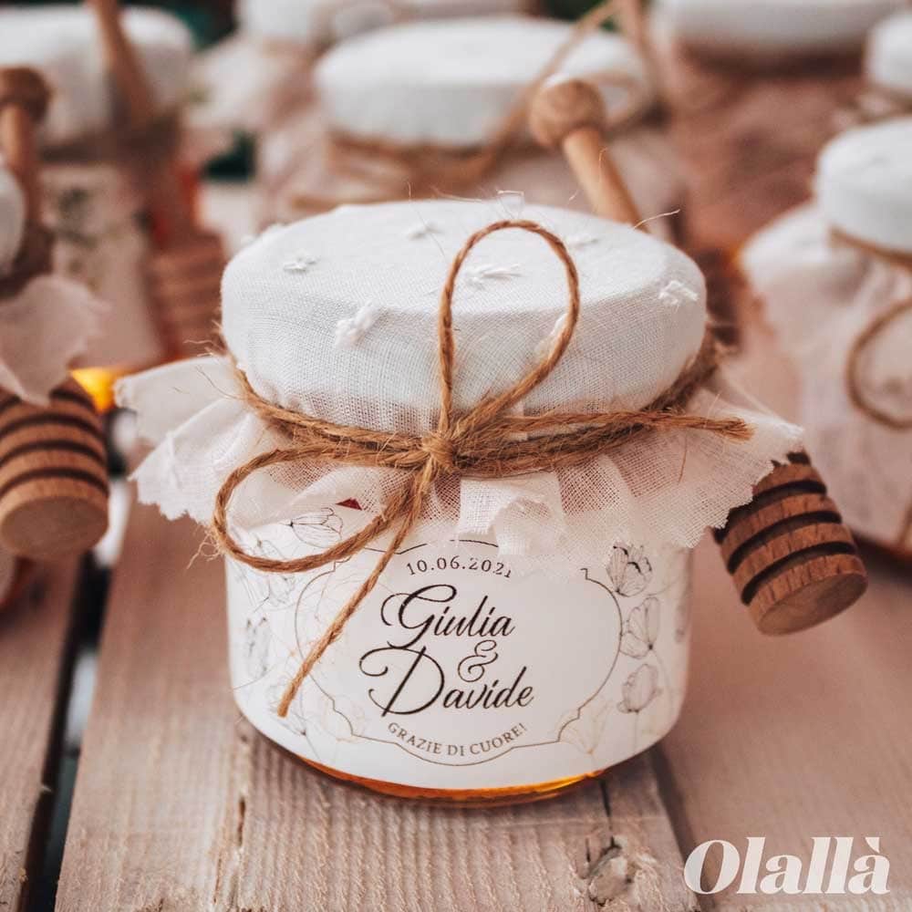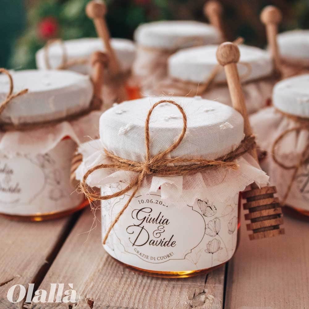 Dolcissimi vasetti di miele con etichetta dal delicato decoro botanico con fiori e foglie nei toni del beige viene personalizzata con i nomi e la data del vostro evento, spago di canapa ed un meraviglioso copri vasetto in tessuto con delicati motivi ricamati bianchi. A scelta tra diversi formati, puoi scegliere di riceverle a casa da confezionare autonomamente o di riceverle già pronte e perfette per essere subito disposte sul tavolo del tuo evento. Ideale se stai organizzando un matrimonio rustico, vintage o country chic!