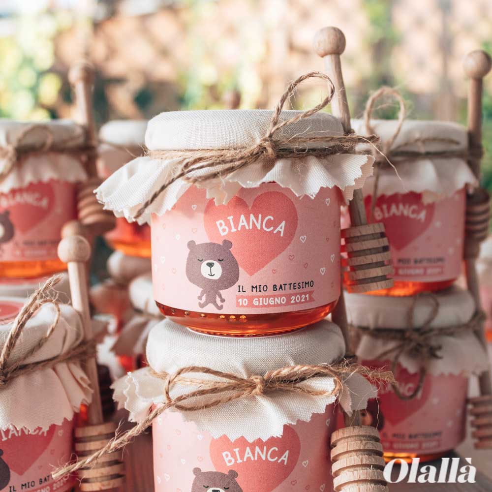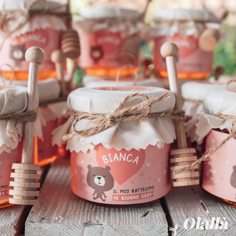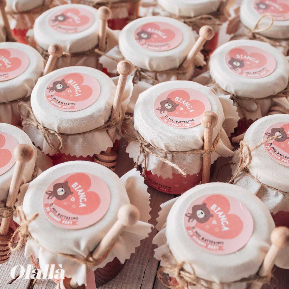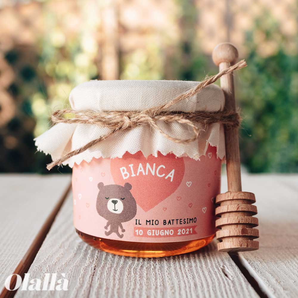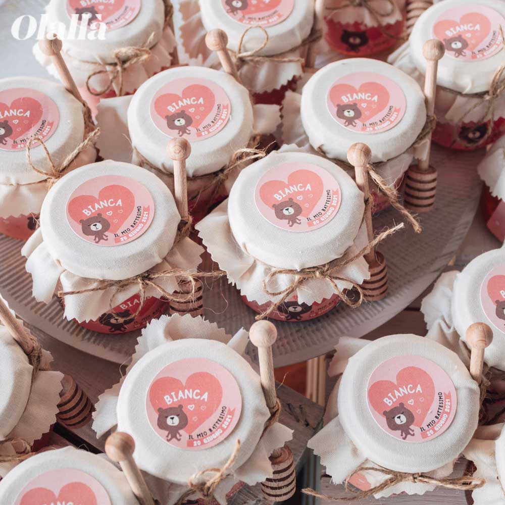 Dolcissimi vasetti di miele personalizzati con un tenero orsetto ed il nome del bambino. Il copri vasetto in tessuto è decorato con un simpatico cuore con la scritta che preferisci e adornato da un nastrino di spago. Personalizza con la tua frase e data speciale. Puoi scegliere di riceverle a casa da confezionare autonomamente o di riceverle già pronte e perfette per essere subito disposte sul tavolo del tuo evento.
