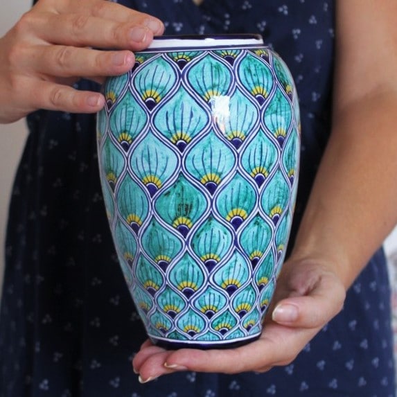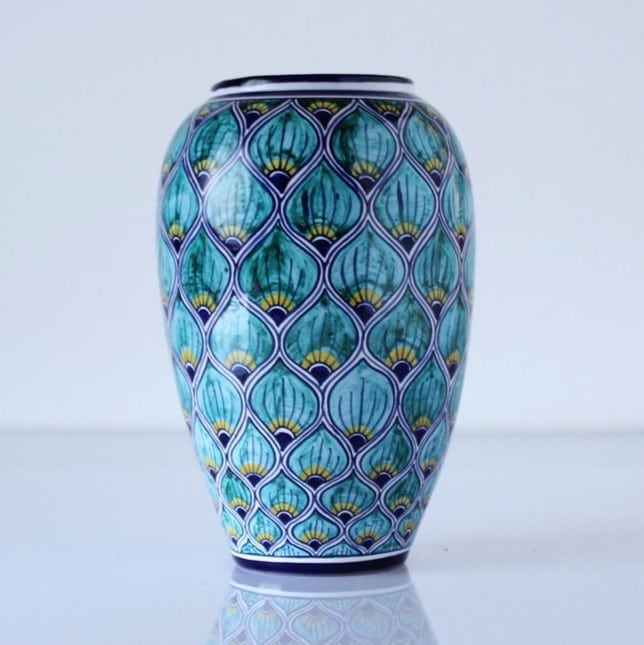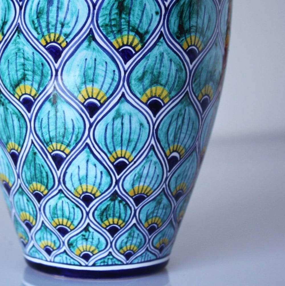 Splendido vaso in ceramica dipinto a mano in stile “pavona”. La decorazione ricorda proprio le piume di un pavone, con i tipici colori blu, turchese e giallo striati.Desideri una dedica o una personalizzazione? Potrà venire dipinta gratuitamente per te qualora tu lo scelga come opzione.