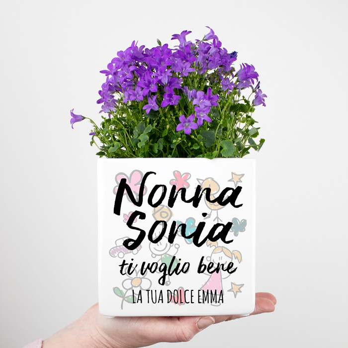 Vaso in ceramica personalizzato con dolci disegni, le frasi che desideri e la tua foto sul retro. L’idea regalo perfetta per la tua nonna amante dei fiori e del giardinaggio. Ceramica emiliana, stampa artigianale, grande qualità per te e le tue piante più belle!