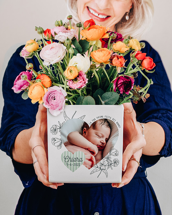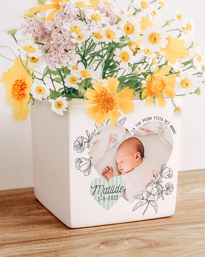 Questo splendido vaso in ceramica viene realizzato e stampato artigianalmente in Italia. Potete personalizzare il vaso con la foto e le frasi che desideri, mentre la decorazione rimane fissa.