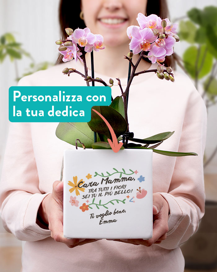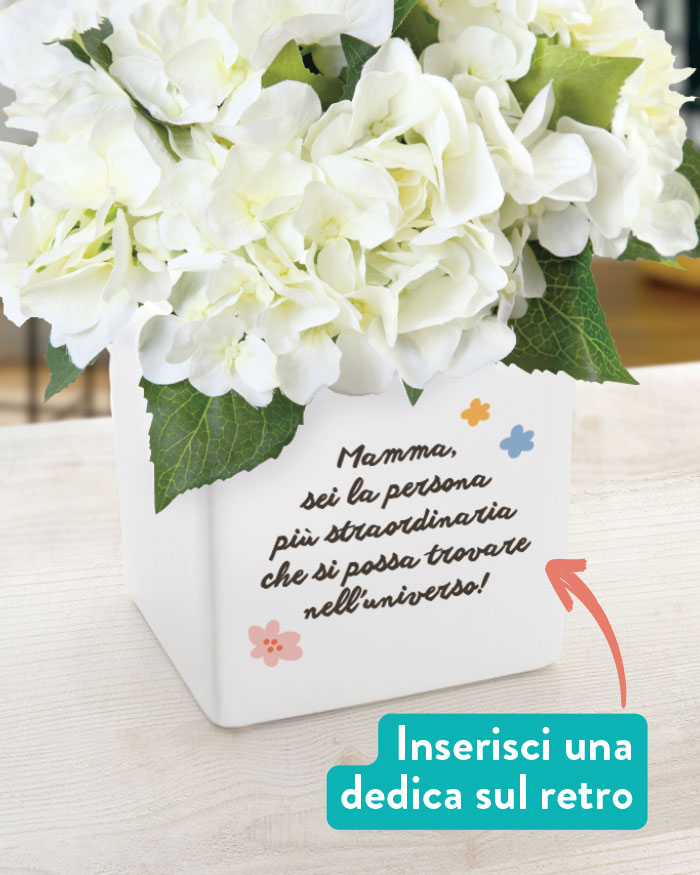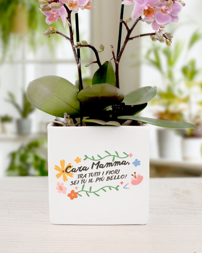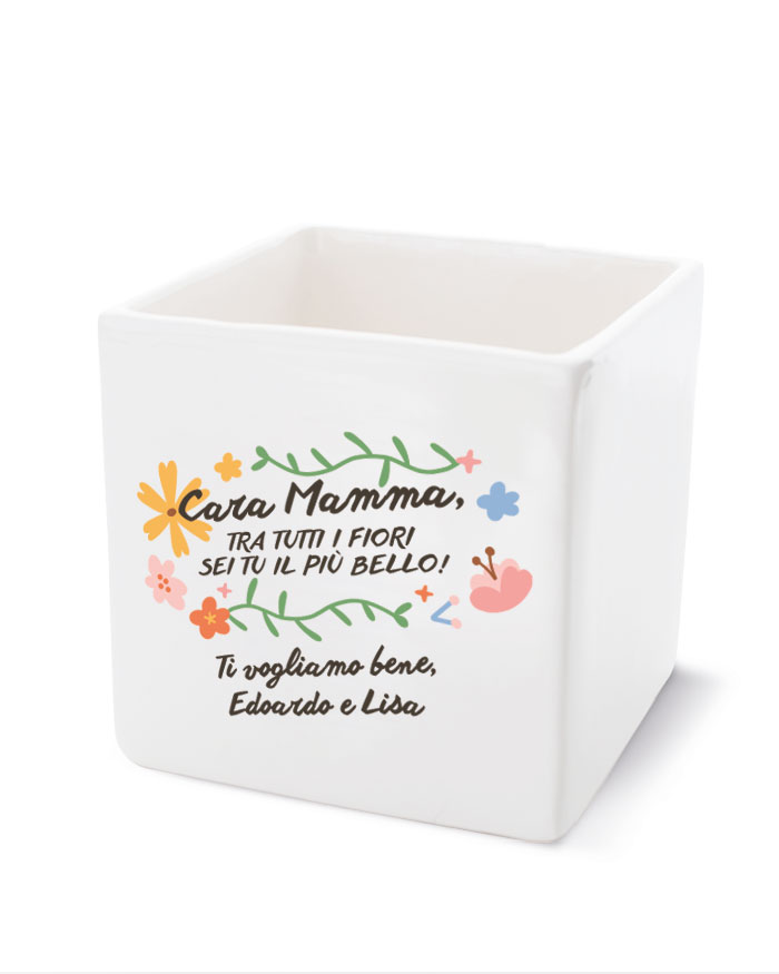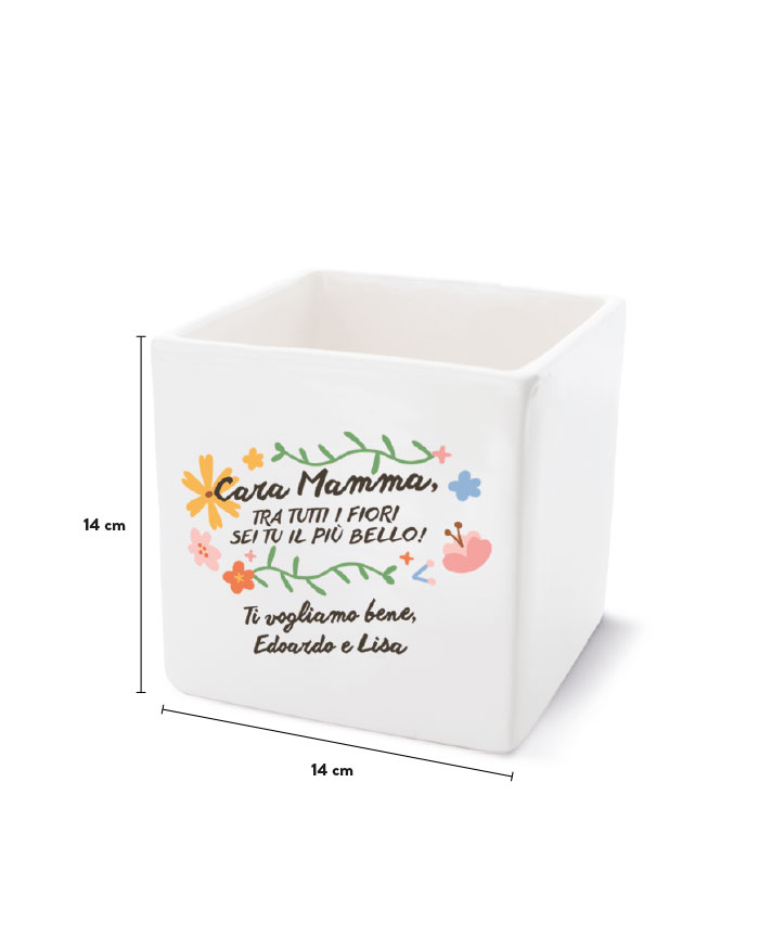 ATTENZIONE: La frase “Cara Mamma, tra tutti i fiori sei tu il più bello” resta fissa, mentre è personalizzabile la dedica in basso.