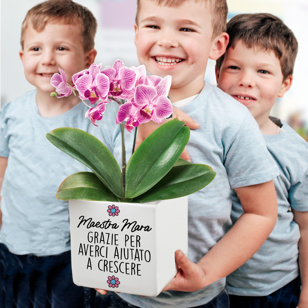 Vaso in ceramica personalizzato con la frase “Grazie per averci aiutato a crescere” e una breve dedica nella parte superiore. Il vaso è decorato con fiorellini ed è personalizzabile con la dedica che volete scrivere per la maestra a cui fare il regalo. Un’idea regalo perfetta per la persona che vi ha aiutato a crescere il vostro bambino o la vostra bambina.