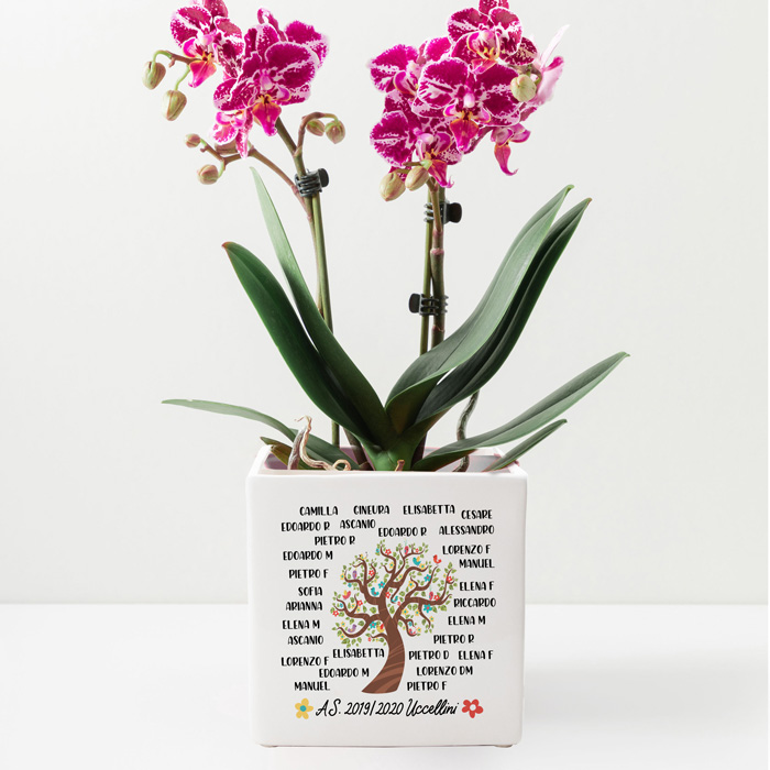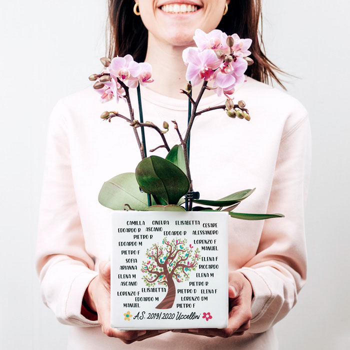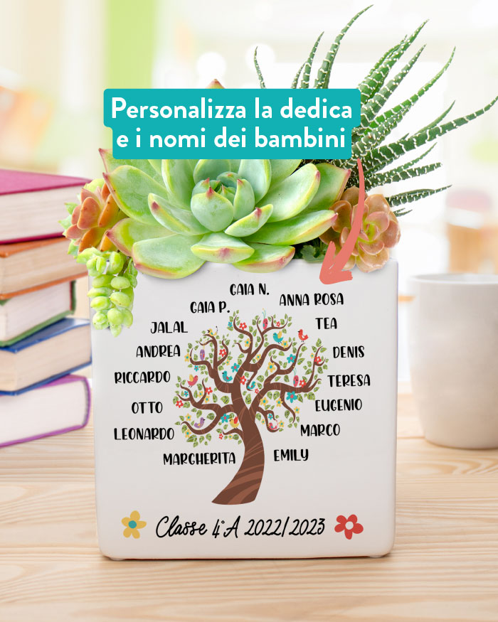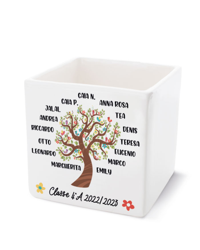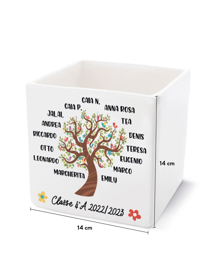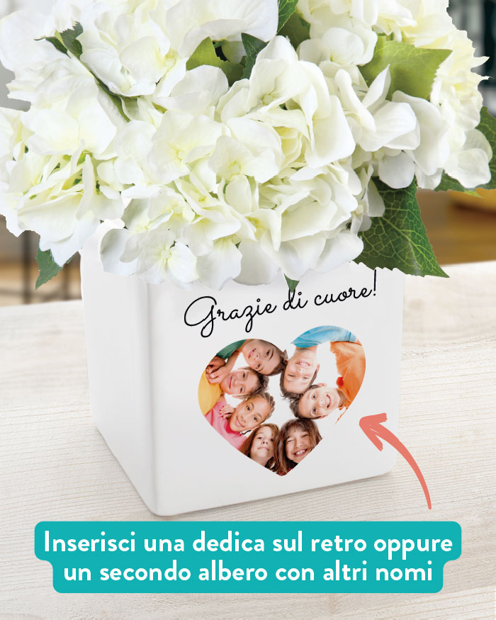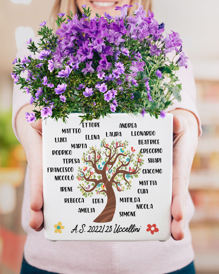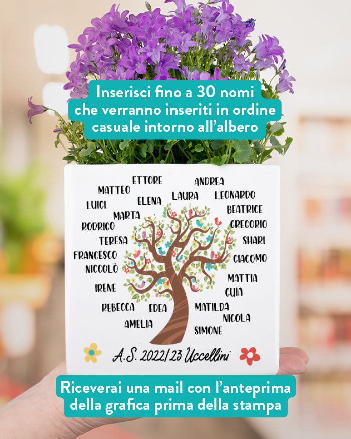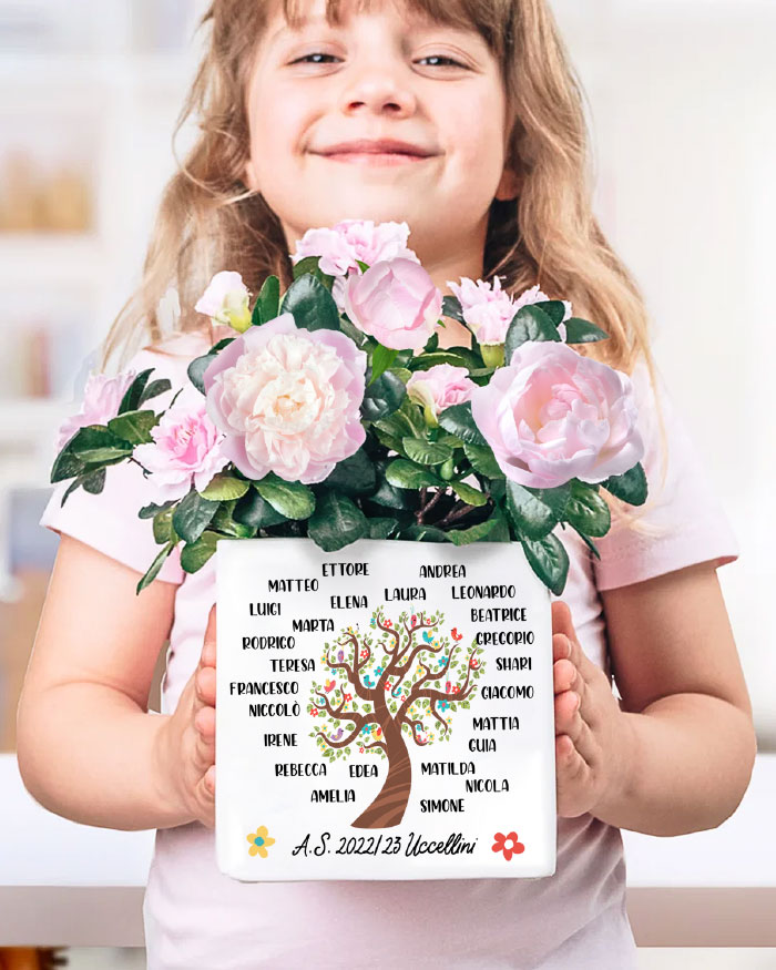 Personalizza l’albero sul fronte con i nomi degli alunni e aggiungi una breve intestazione in basso. Il retro del vaso può essere ulteriormente personalizzato con la tua dedica del cuore per la maestra!