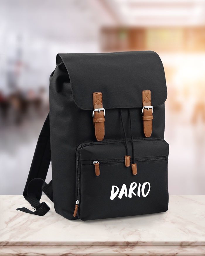 Zaino in stile vintage personalizzabile con nome sulla tasca superiore, l’ideale per avere un tocco di classe senza rinunciare alla comodità. Perfetto per dare un tocco vintage e ricercato al vostro outfit, vi accompagnerà durante le vostre trasferte quotidiane! Che si tratti di recarsi a scuola, in ufficio o all’università questo zaino capiente e maneggevole sarà perfetto per contenere tutto il necessario tra cui astucci, quaderni e computer grazie al comodo scomparto imbottito.