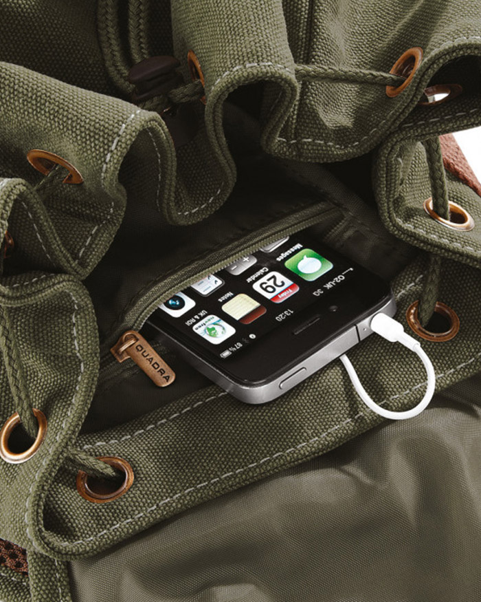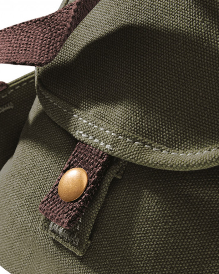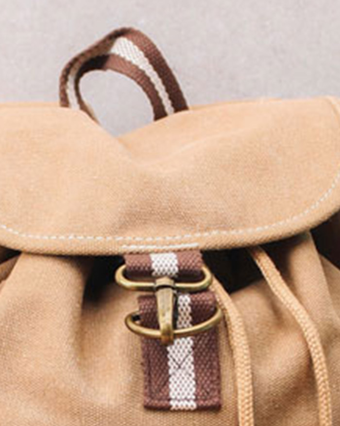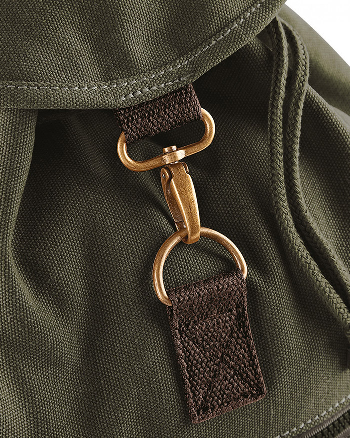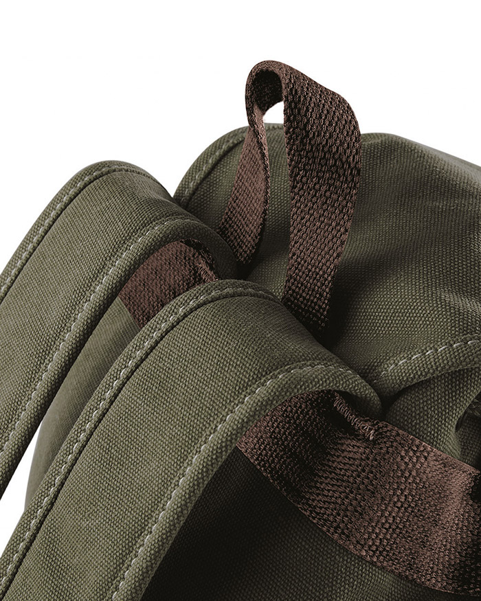 Materiali: Canvas lavato, zip e ganci in bronzo. Sono presenti tasca frontale con zip, tasca interna con zip, tasche laterali, base imbottita, chiusura con cordino, spalline imbottite e regolabili.