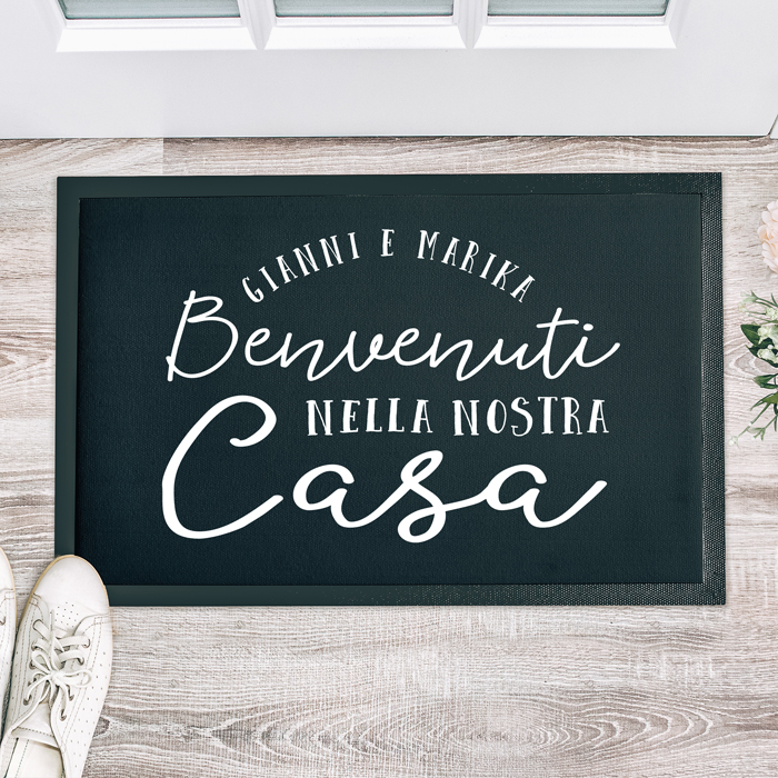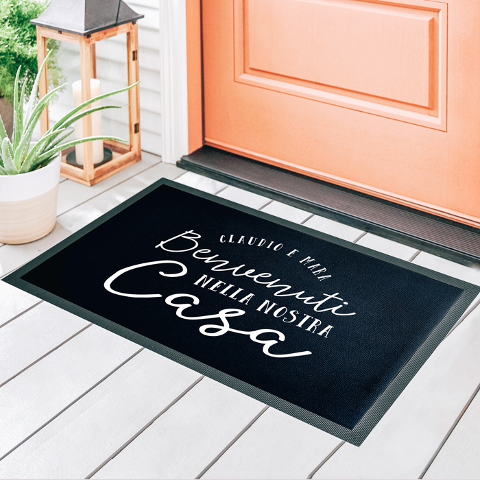 Questo zerbino personalizzato ha un fondo in gomma antiscivolo di colore nero ed è realizzato in tessuto tipo feltro spesso e resistente. E’ indicato per essere utilizzato come tappeto da interno, per poggiare scarpe e ciabatte all’entrata di casa, oppure come secondo zerbino di entrata per appartamenti in condominio. Non è consigliato per fungere da vero e proprio “zerbino” da esterno per la pulizia di scarpe molto sporche o bagnate in quanto, come tutti gli zerbini, la superficie personalizzata andrebbe con il tempo e l’utilizzo a deteriorarsi.